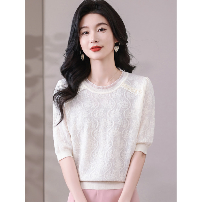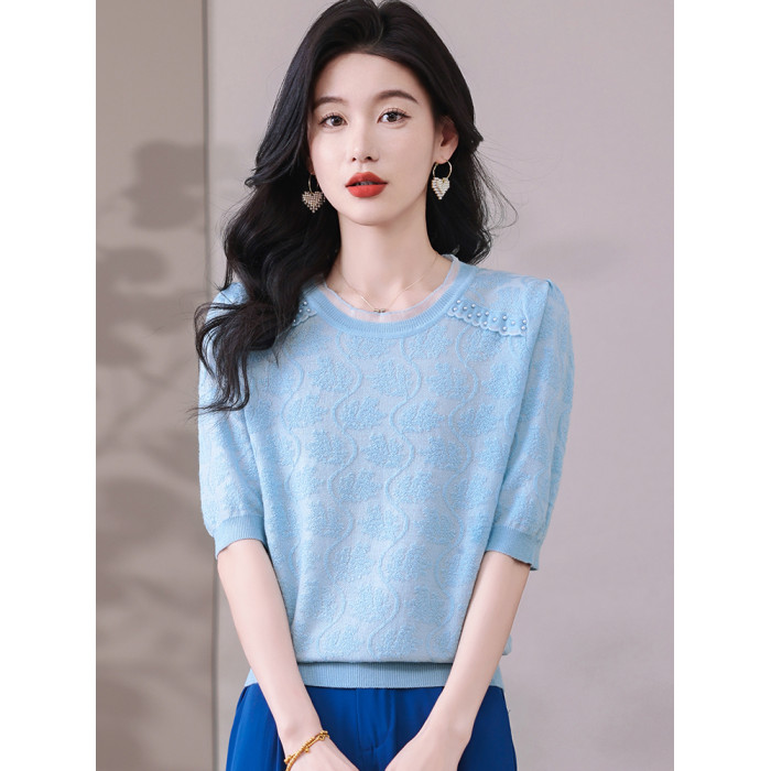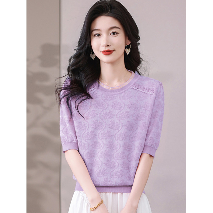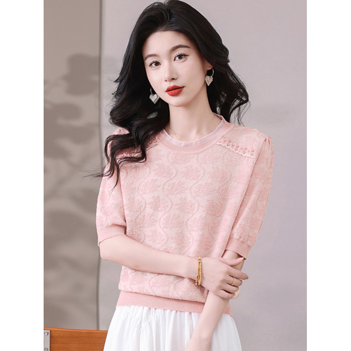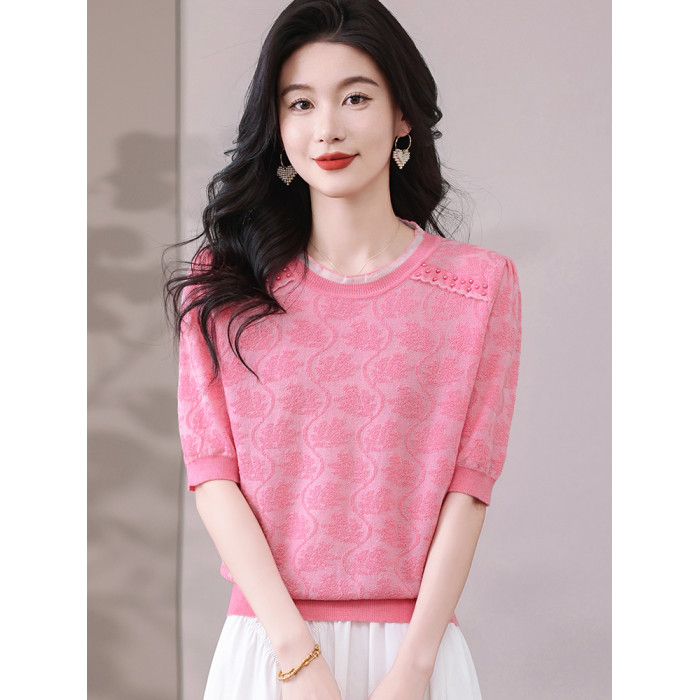 冰絲針織衫女短袖2025新款寬松薄款打底衫粉色萊賽爾天絲t恤上衣