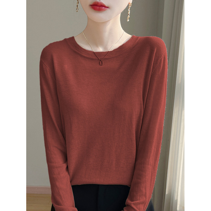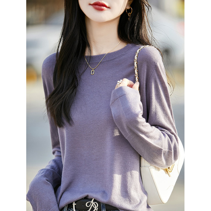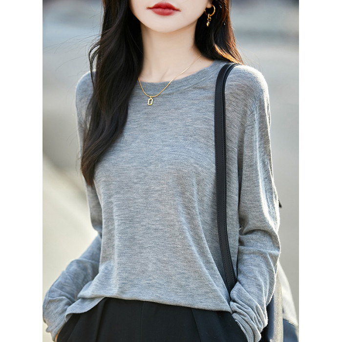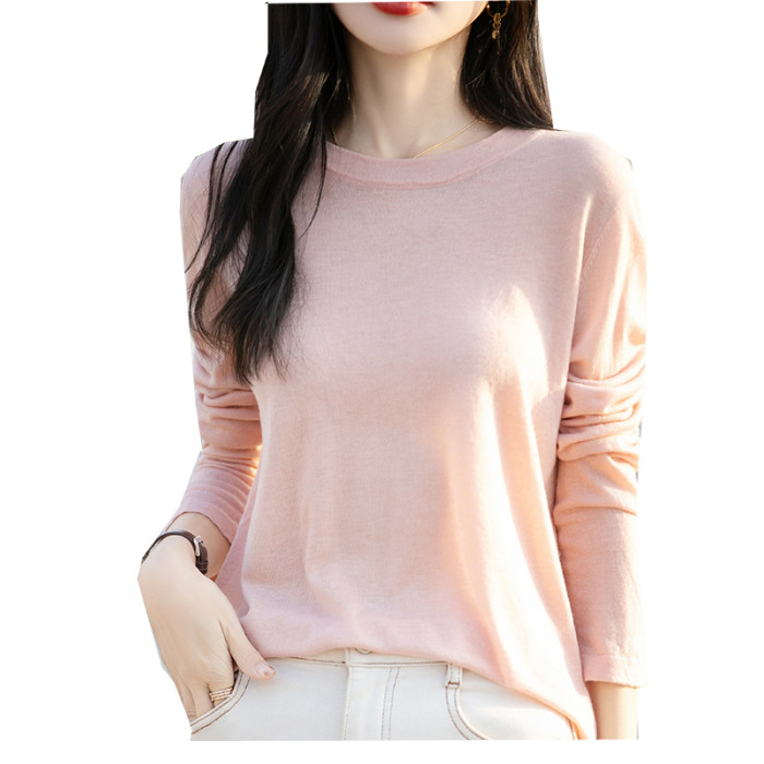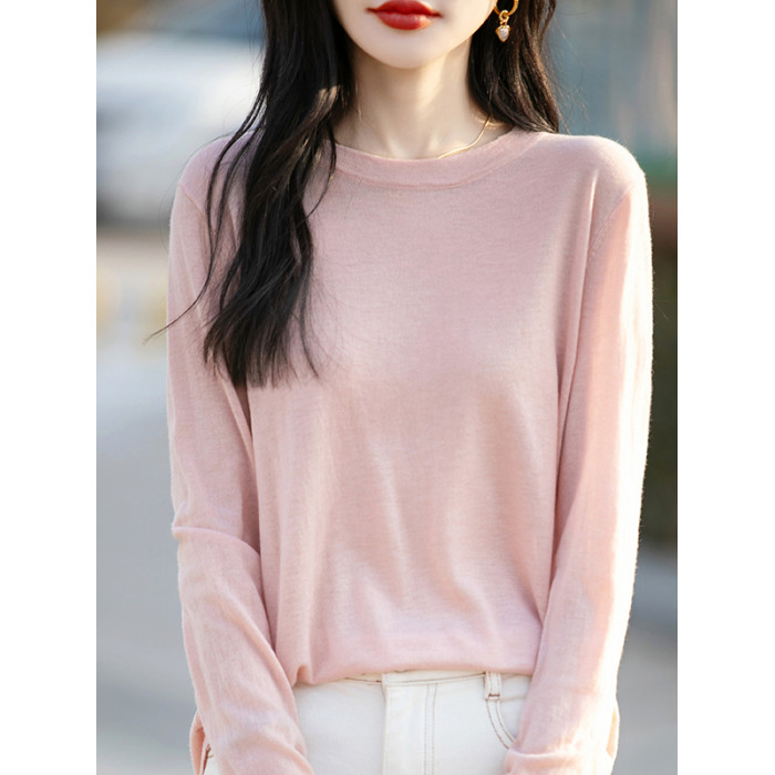 精仿薄款水溶羊毛衫女圓領春秋寬松純色針織長袖內外搭休閒打底衫