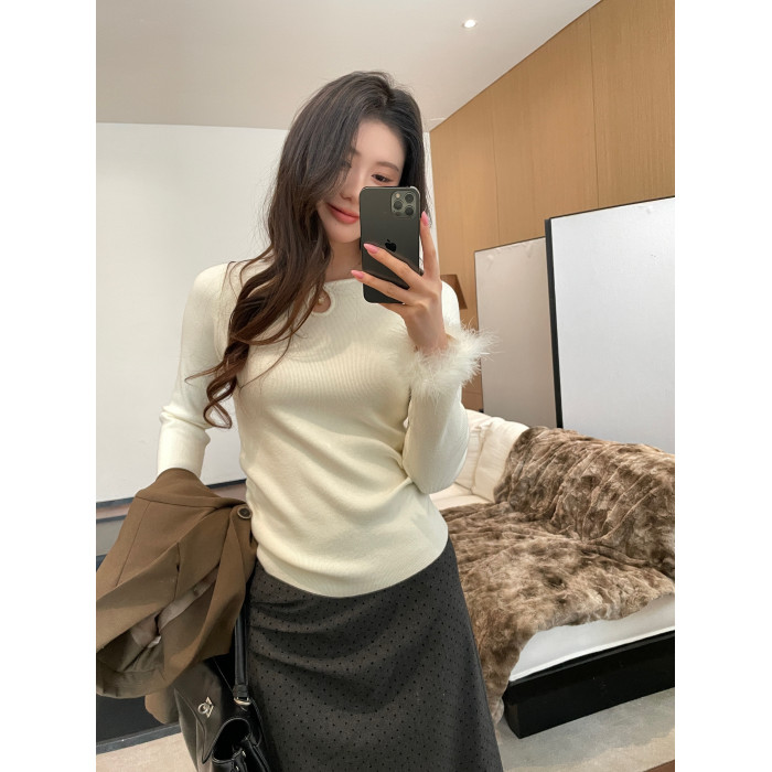 UKILAU春裝新品設計感鏤空長袖內搭上衣女修身顯瘦百搭針織打底衫
