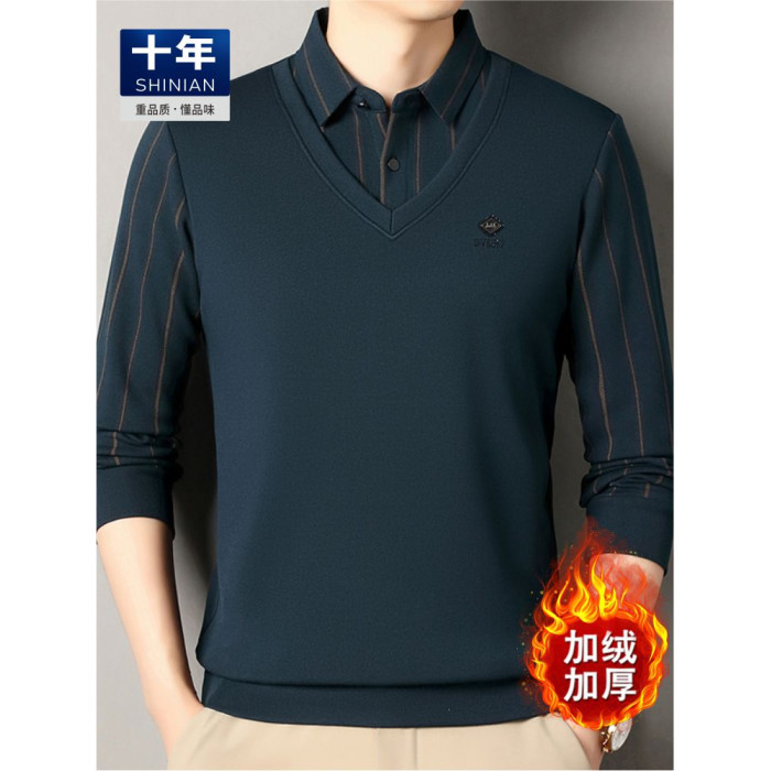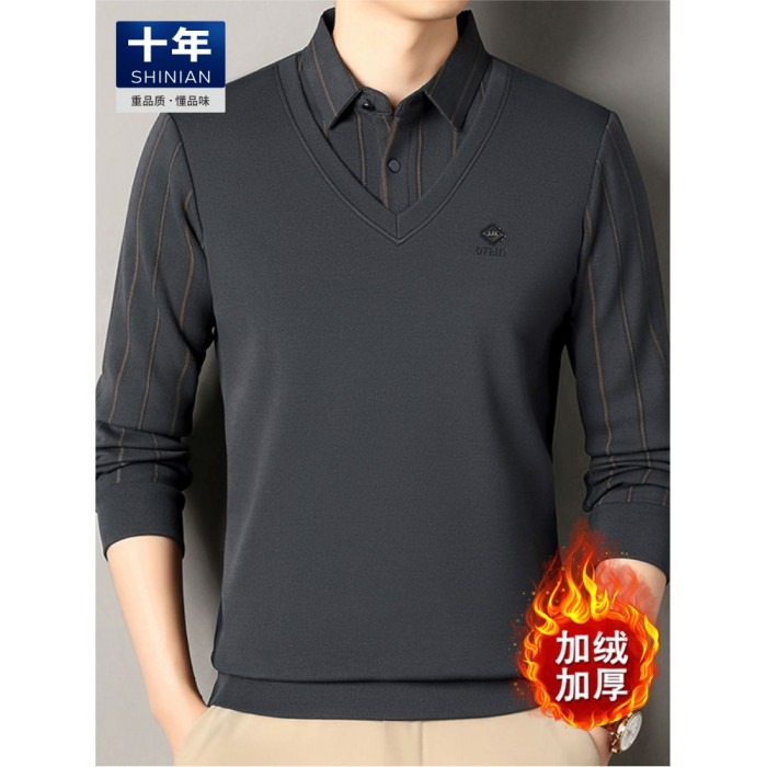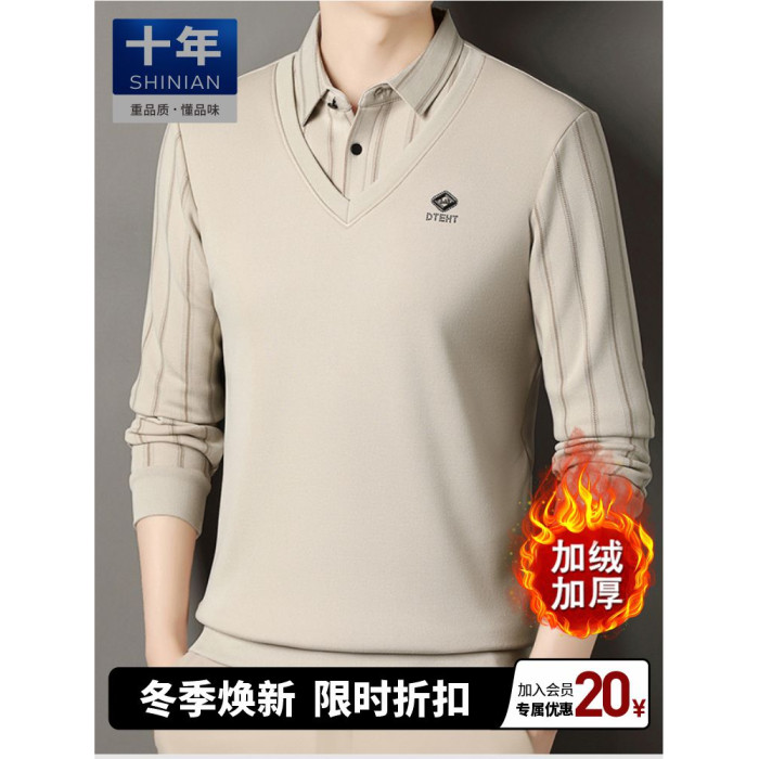 十年品牌男士加絨加厚假兩件衛衣2025冬季保暖內衣POLO衫男打底衫