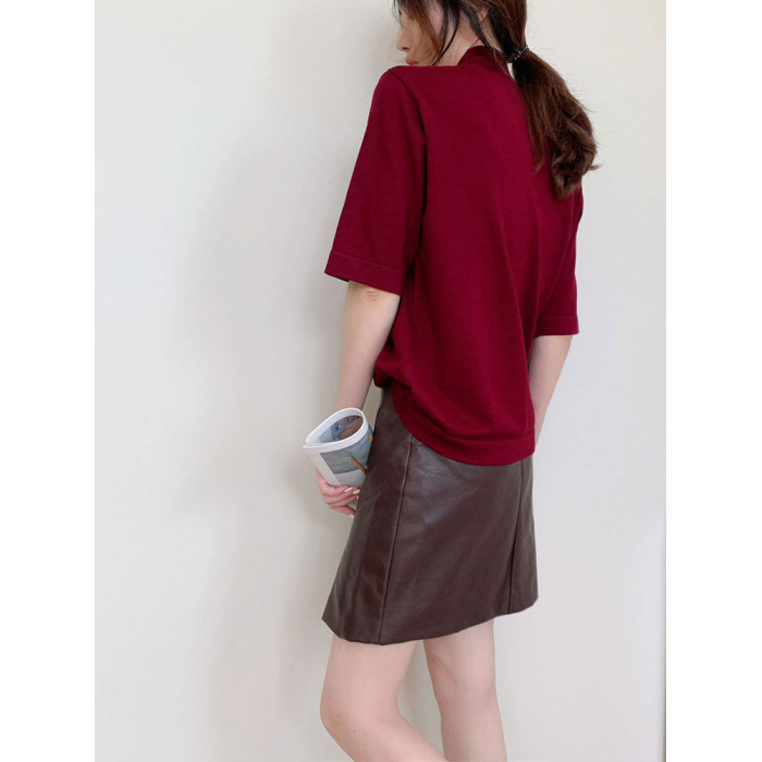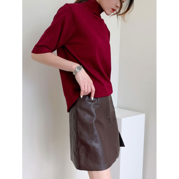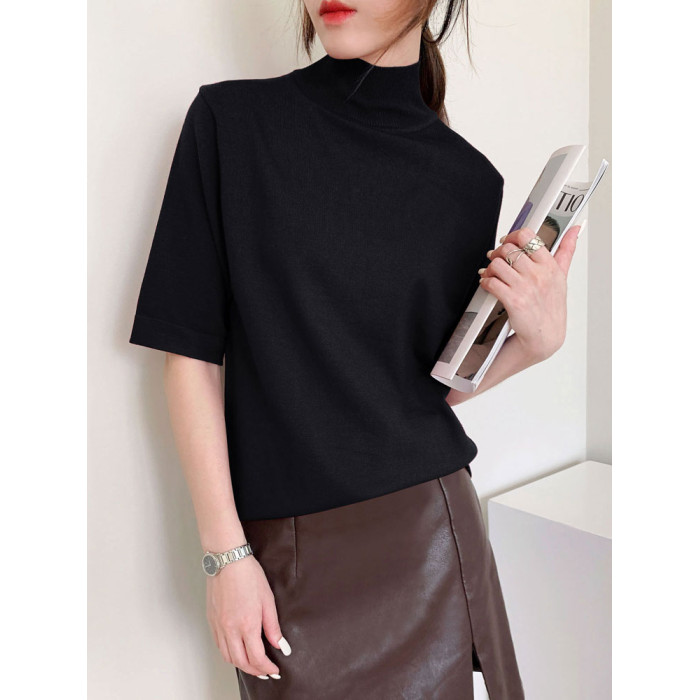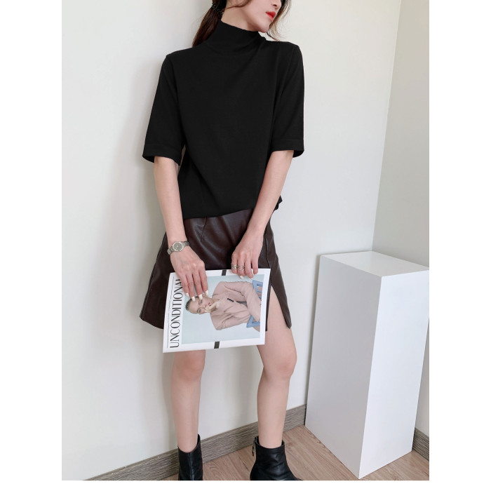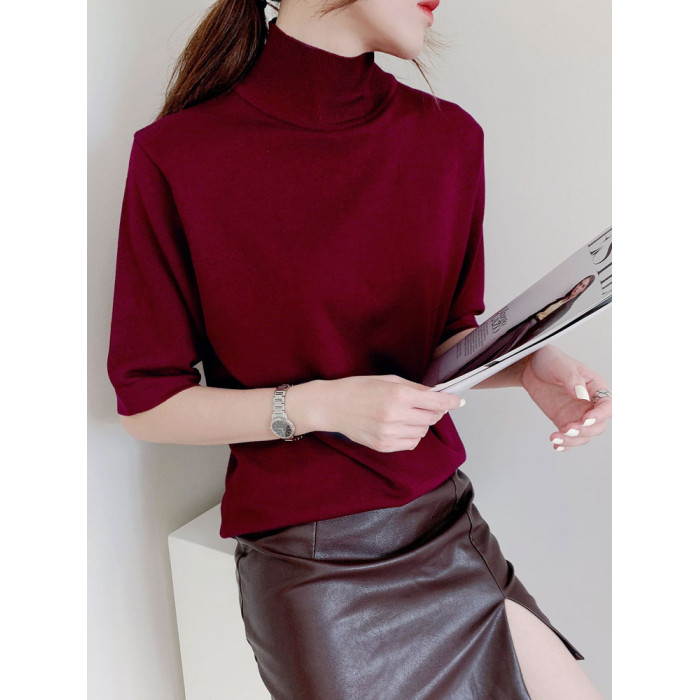 秋季新款韓版寬松袖半高領五分袖針織打底衫純色套頭百搭女士上衣