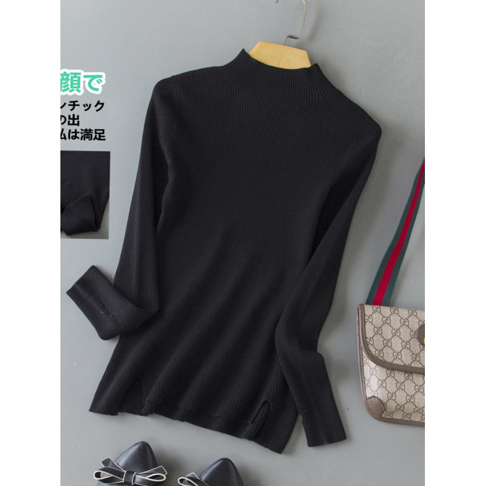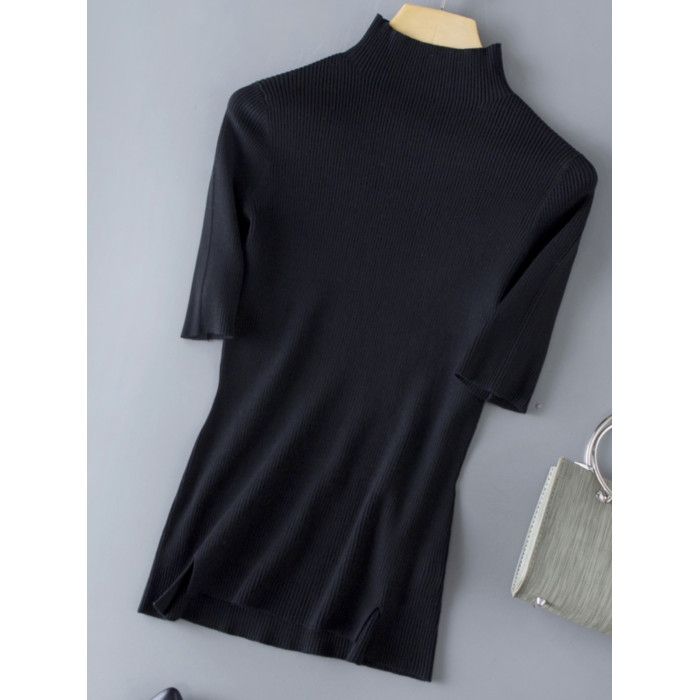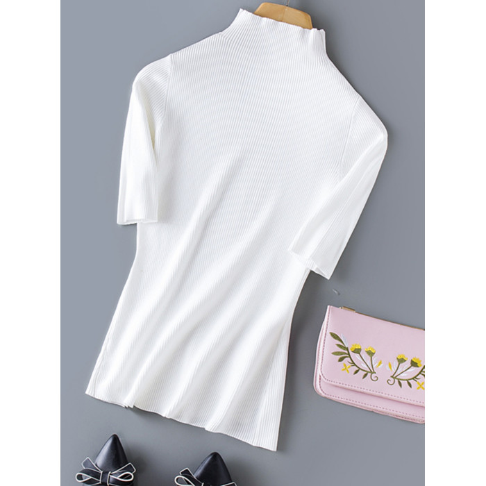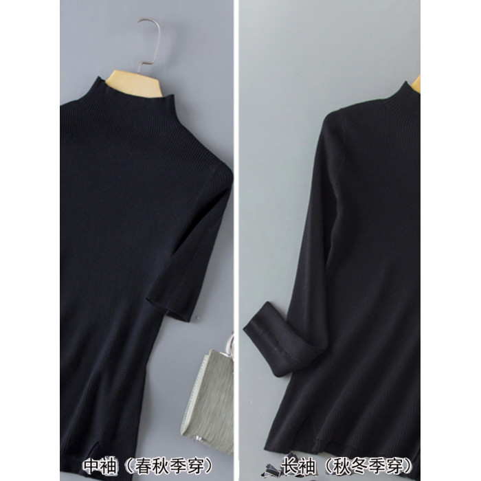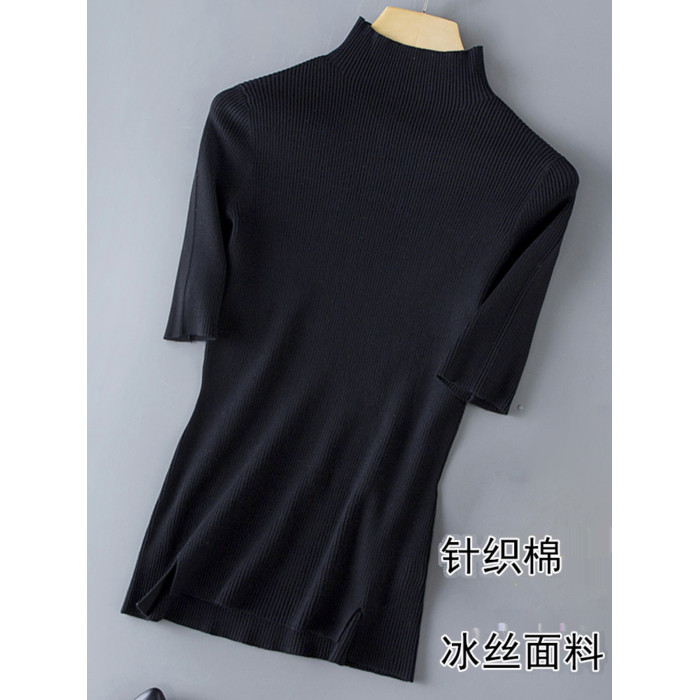 春季新款冰絲針織衫女半高領短袖打底衫女天絲中袖春秋修身上衣女