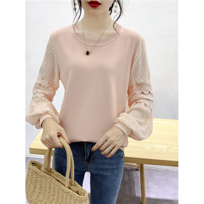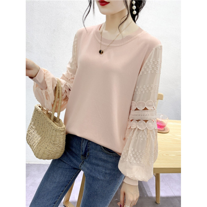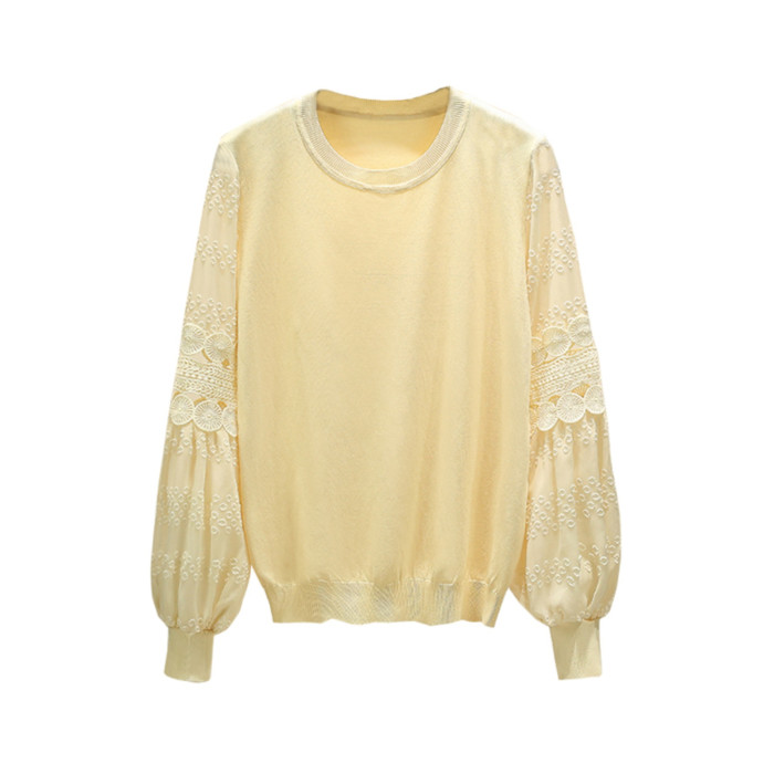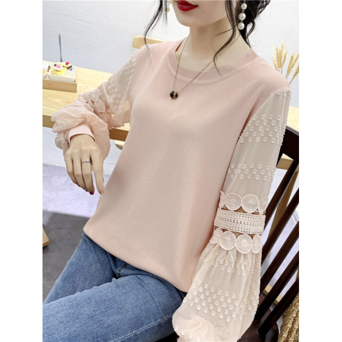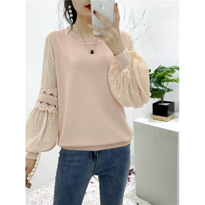 蕾絲拼接打底衫2025早秋套頭圓領鏤空薄針織衫雪紡燈籠袖超仙上衣