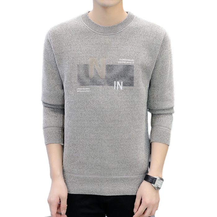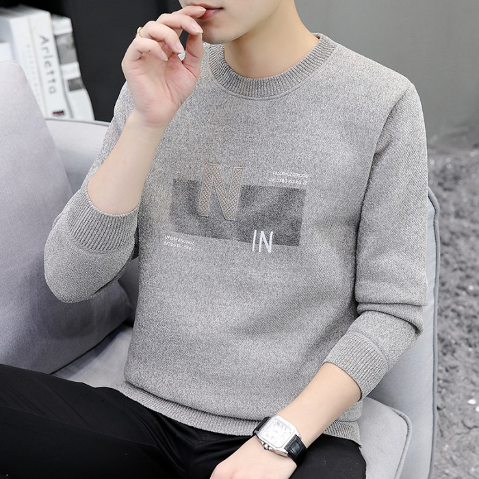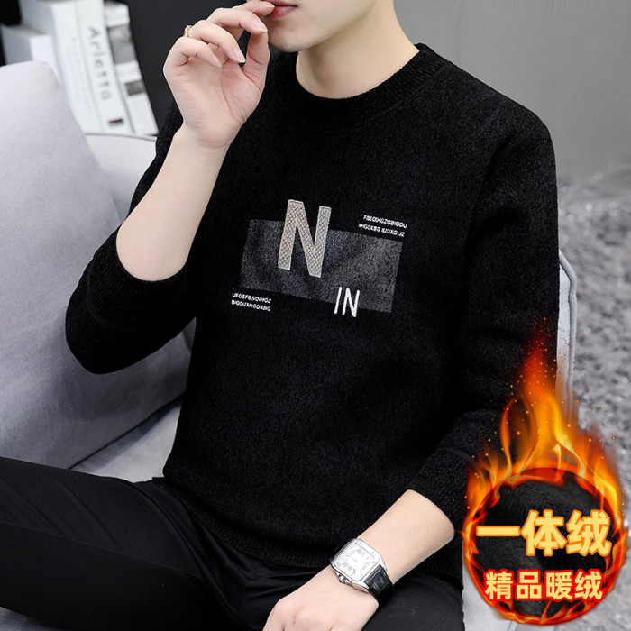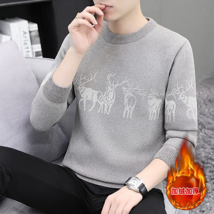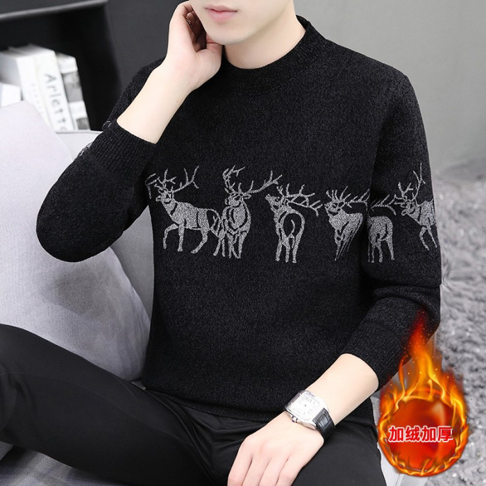 圓領毛衣男加絨加厚秋冬季一體絨針織打底衫男內搭冬裝提花羊毛衫