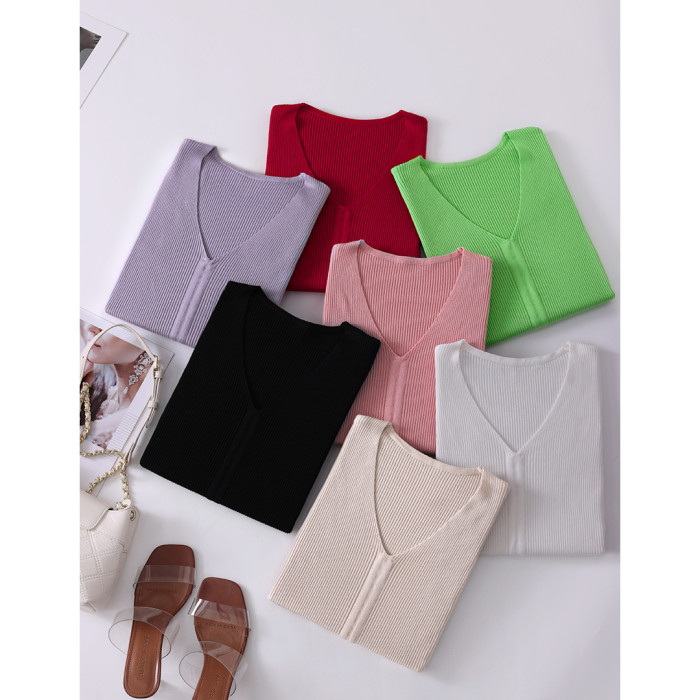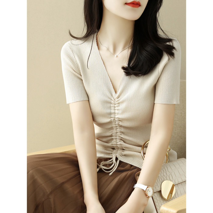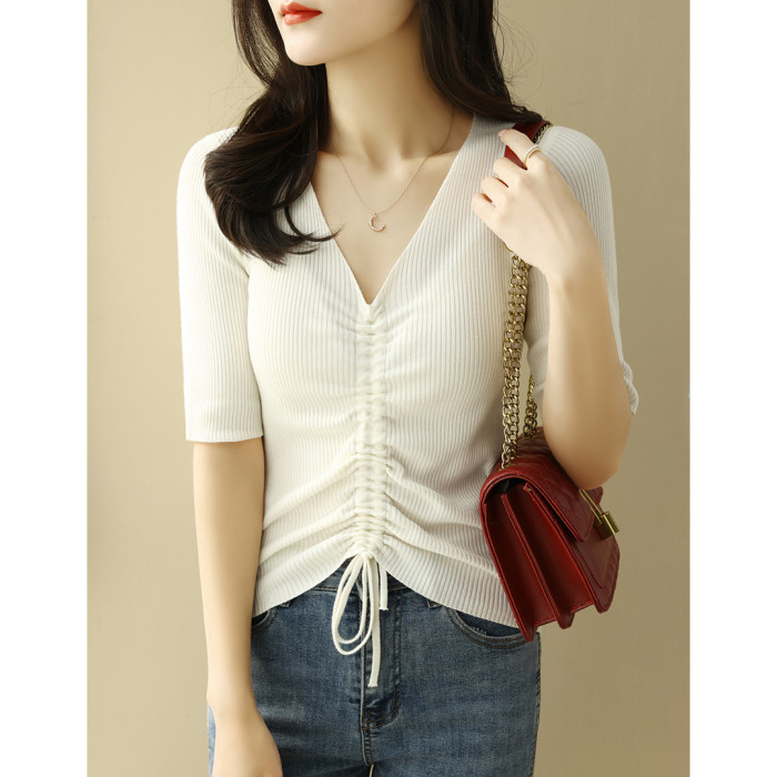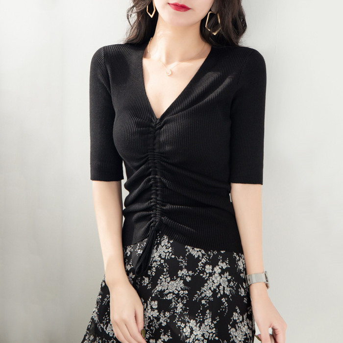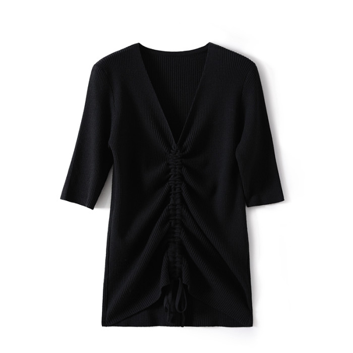 新款2024春秋v領抽繩系帶五分袖針織打底衫女修身黑色中袖上衣薄