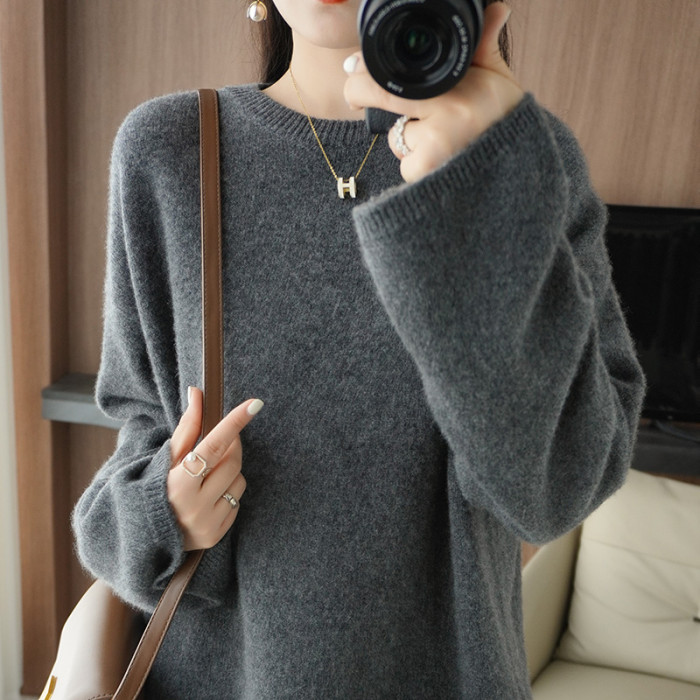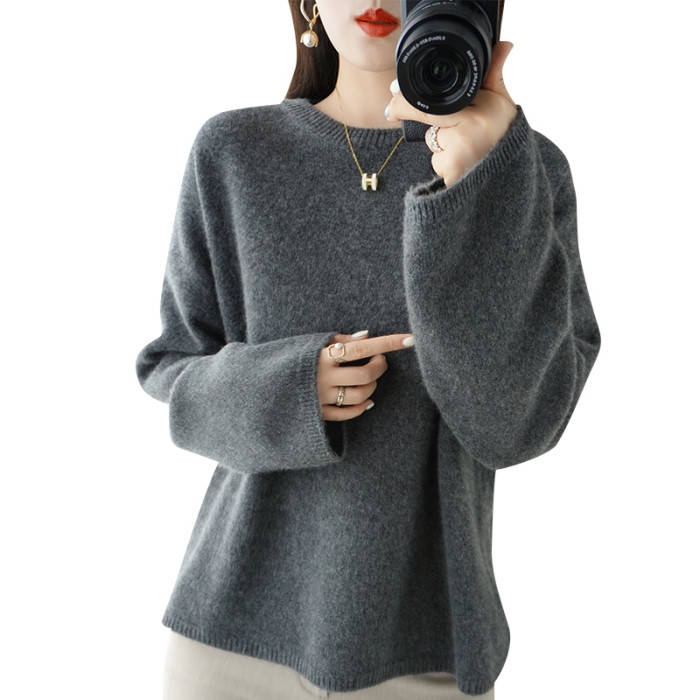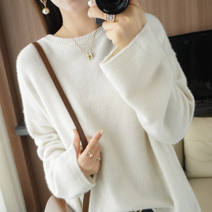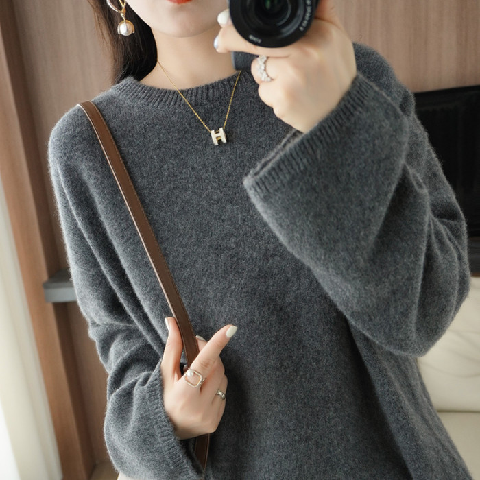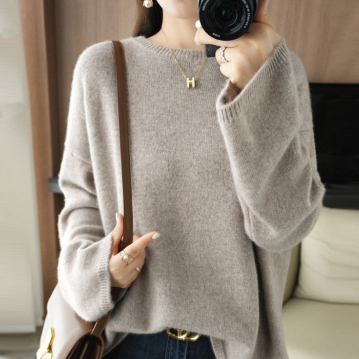 秋冬新款羊絨針織衫女圓領落肩內搭寬松百搭毛衣套頭純羊毛打底衫