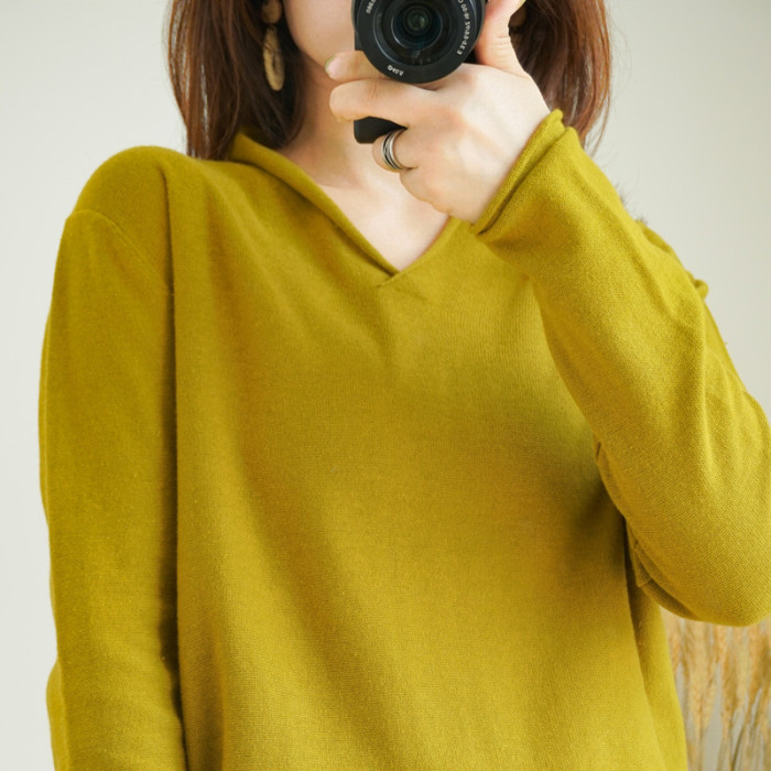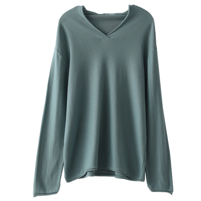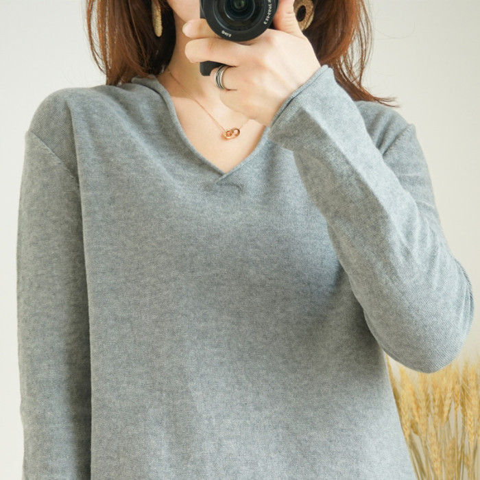 100%純棉女V領打底衫寬松長袖針織衫純色棉線衣百搭套頭休閒毛衣