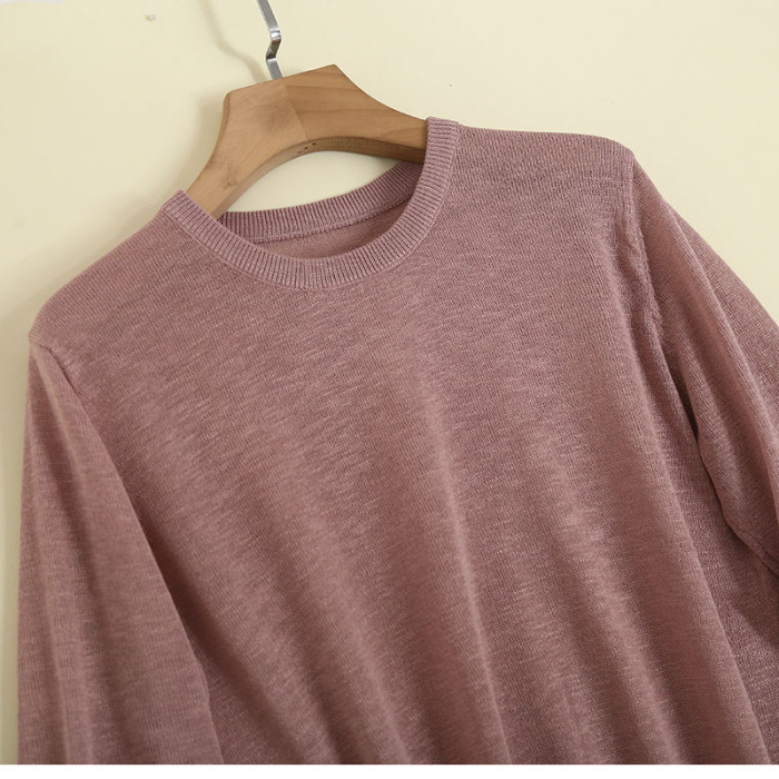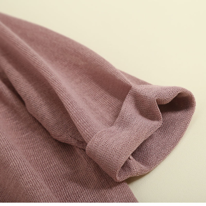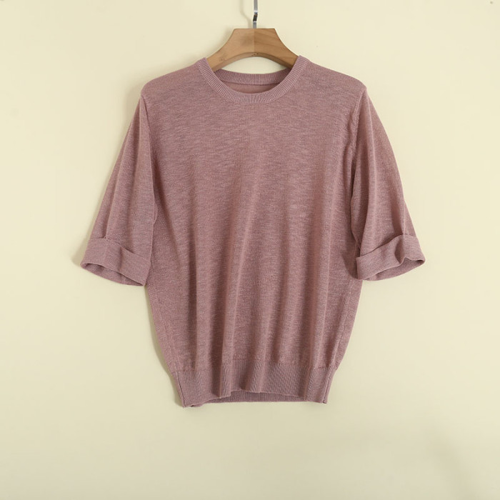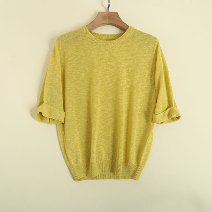 夏季女士亞麻短袖針織衫打底衫寬松套頭純色薄款透視性感顯瘦