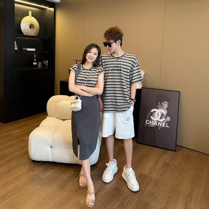 母女連衣裙親子裝夏一家三四口小月齡嬰兒爬服高級父子短袖條紋T