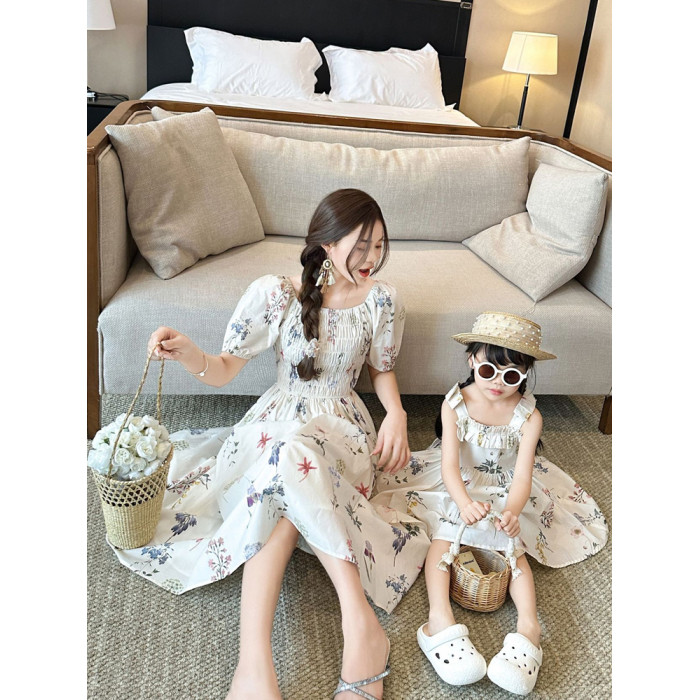 海邊度假親子裝母女裝夏懷舊走秀復古港風一家三口碎花襯衫連衣裙