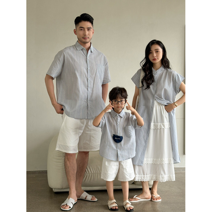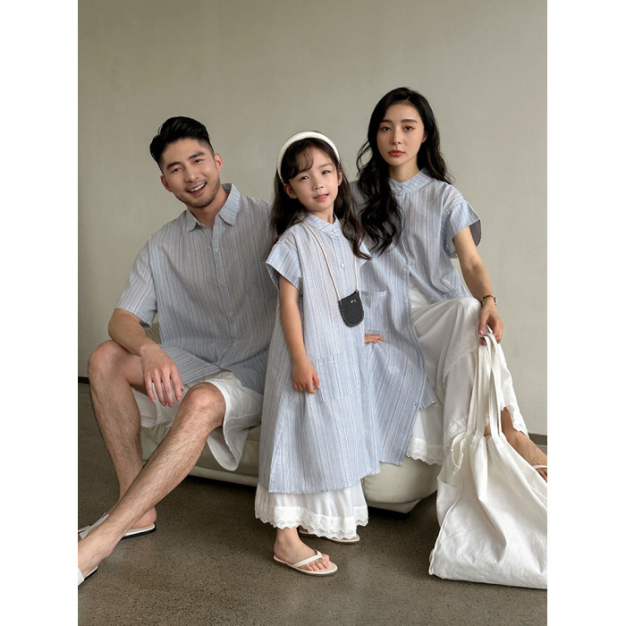 超火的親子裝夏季一家三口2025新款條紋短袖襯衣母女連衣裙度假潮
