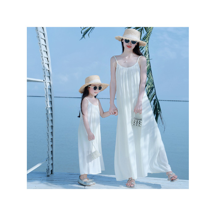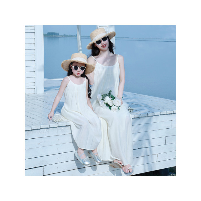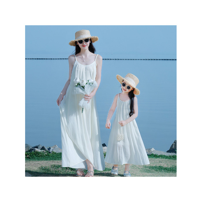 海邊度假親子服裝母女裝米白色2025巨好看三亞出遊沙灘吊帶連衣裙
