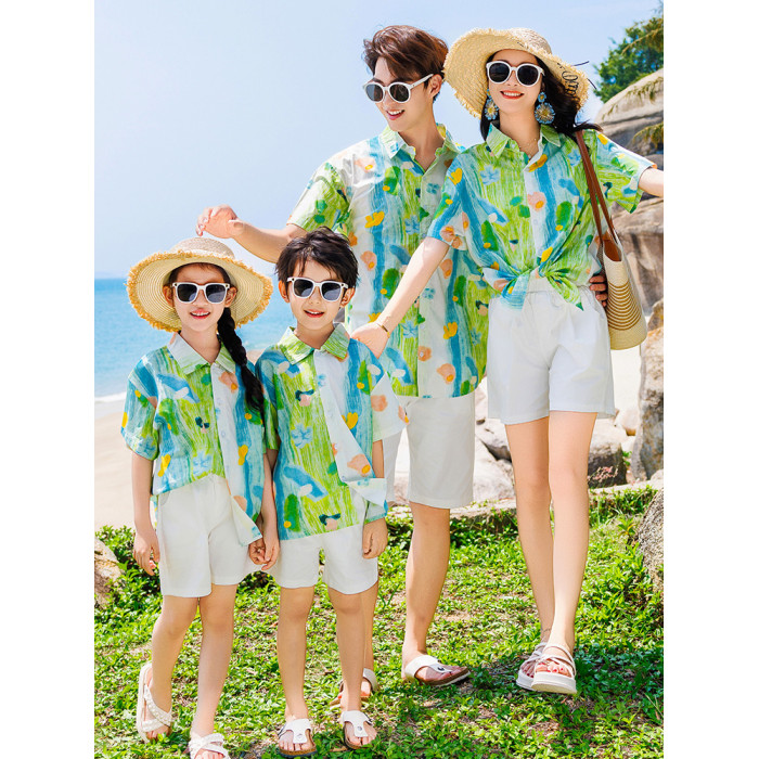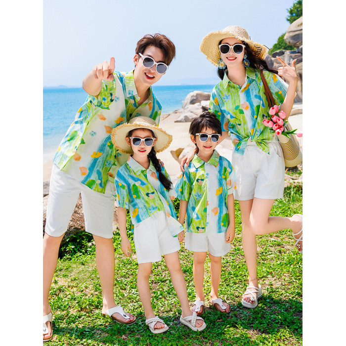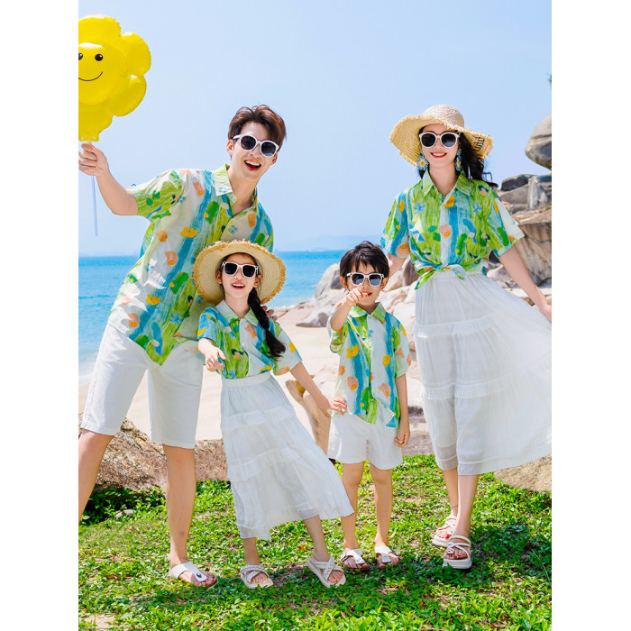 親子裝一家三口四口2025新款母女連衣裙海邊沙灘度假短袖襯衫套裝