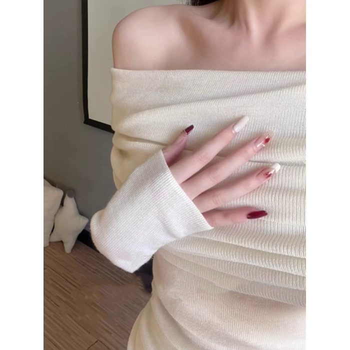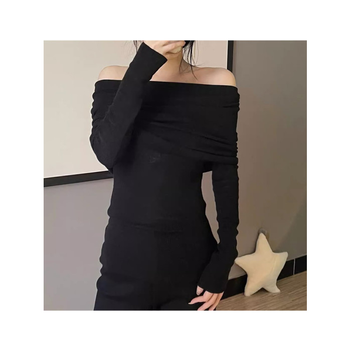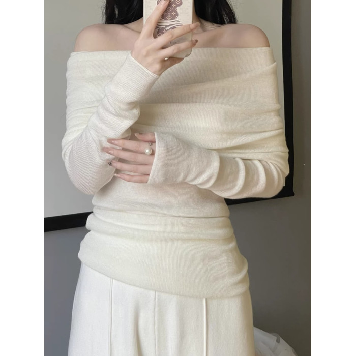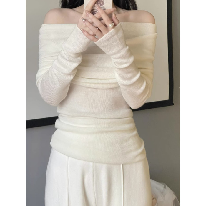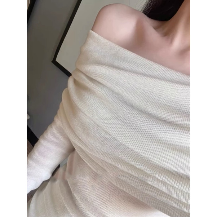 2025春秋新款法式一字肩針織衫女性感緊身上衣茶系氣質露肩打底衫
