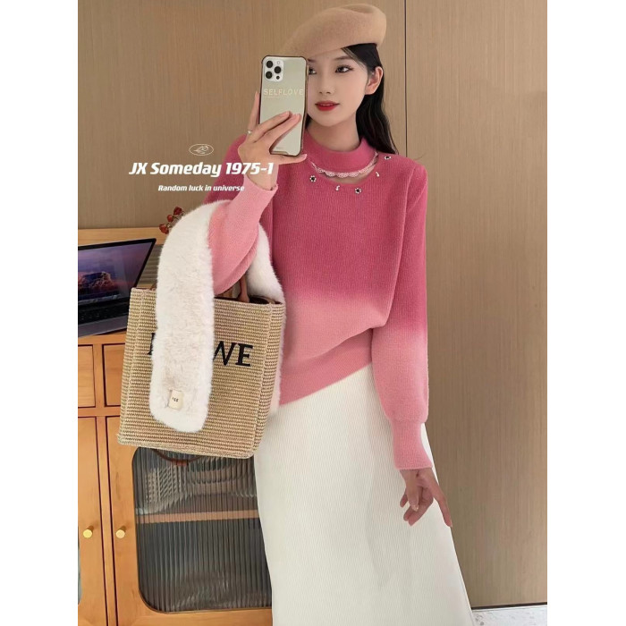2024今年流行歐貨毛衣粉色漸變色套頭半高領鏤空長袖針織打底衫女