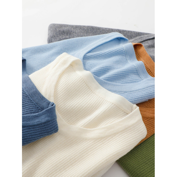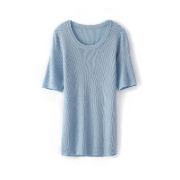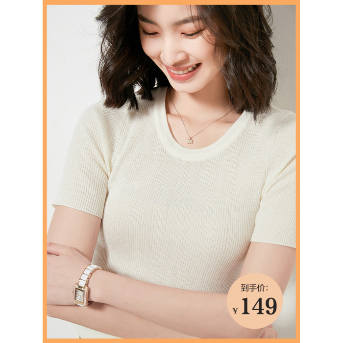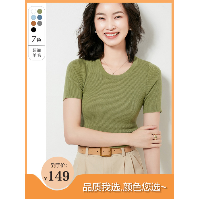 薄款羊毛衫女圓領短袖套頭針織衫女士上衣短款修身百搭純色打底衫