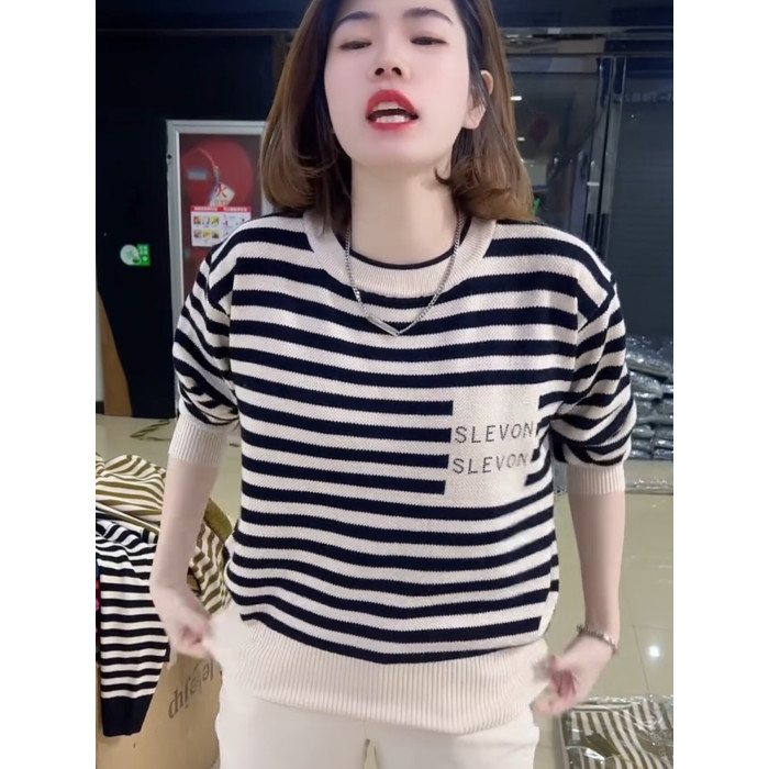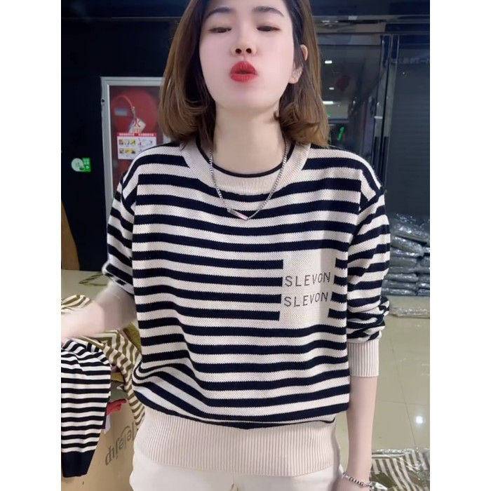 2025春秋新款圓領大碼毛衣條紋上衣女寬松時尚顯瘦上衣針織打底衫