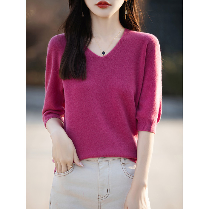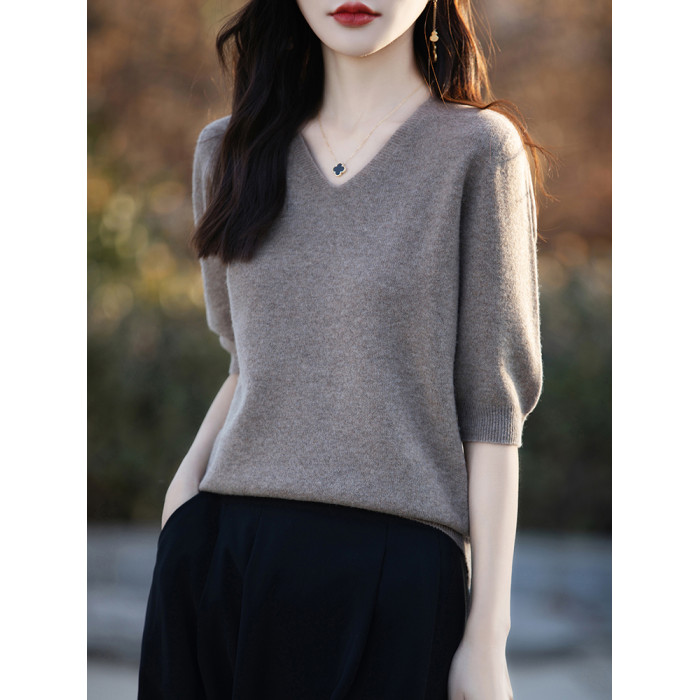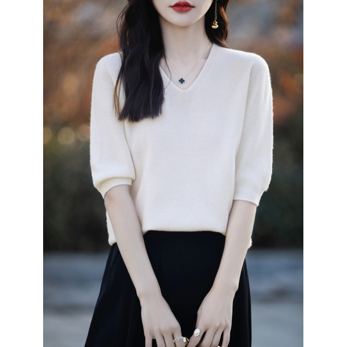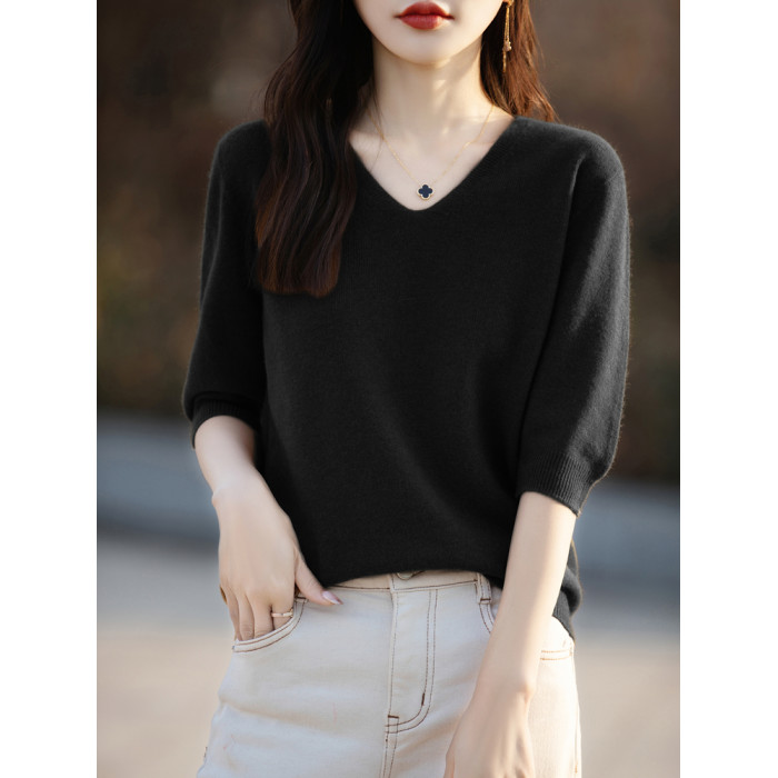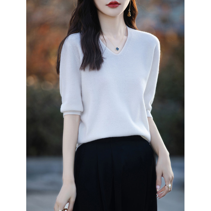 一線成衣針織短袖V領女五分袖薄內搭春夏親膚羊毛寬松半袖打底衫