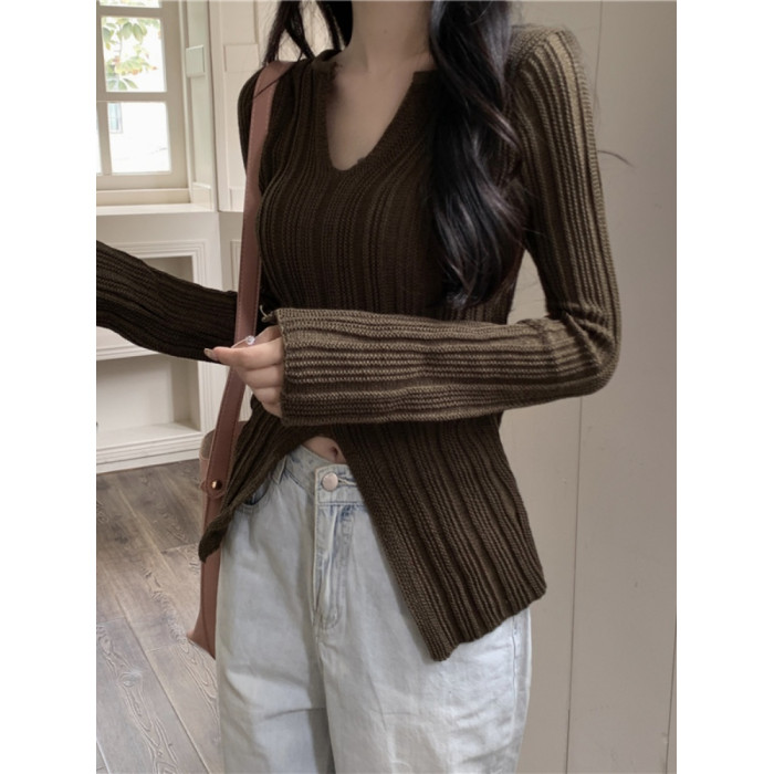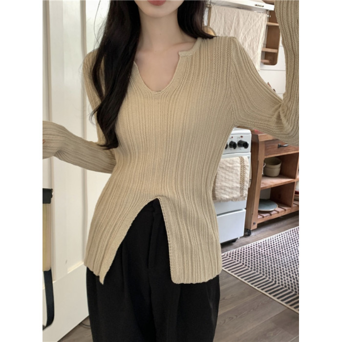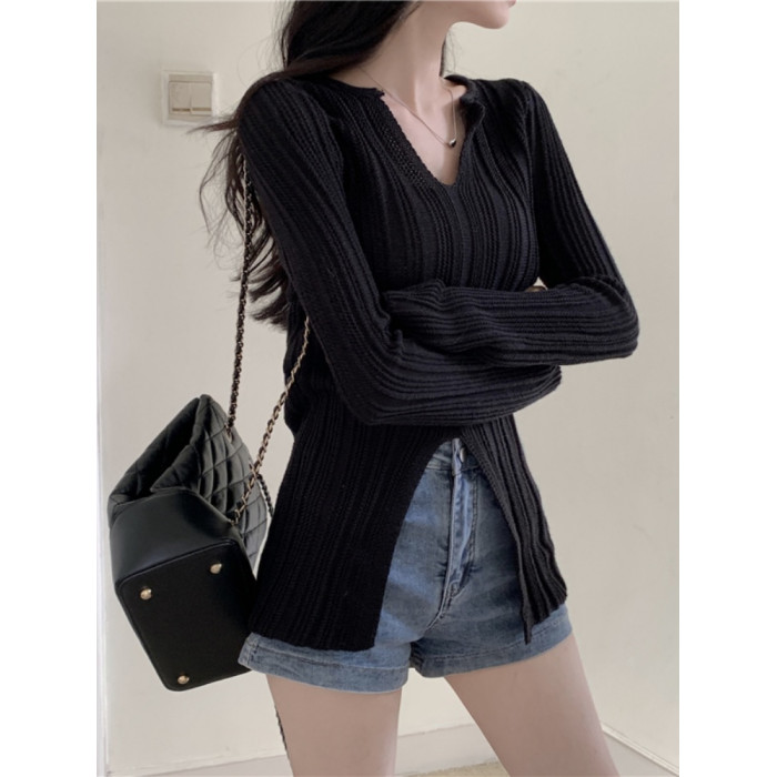純欲絕美低領黑色打底衫女春秋設計感別致開叉修身內搭針織衫上衣