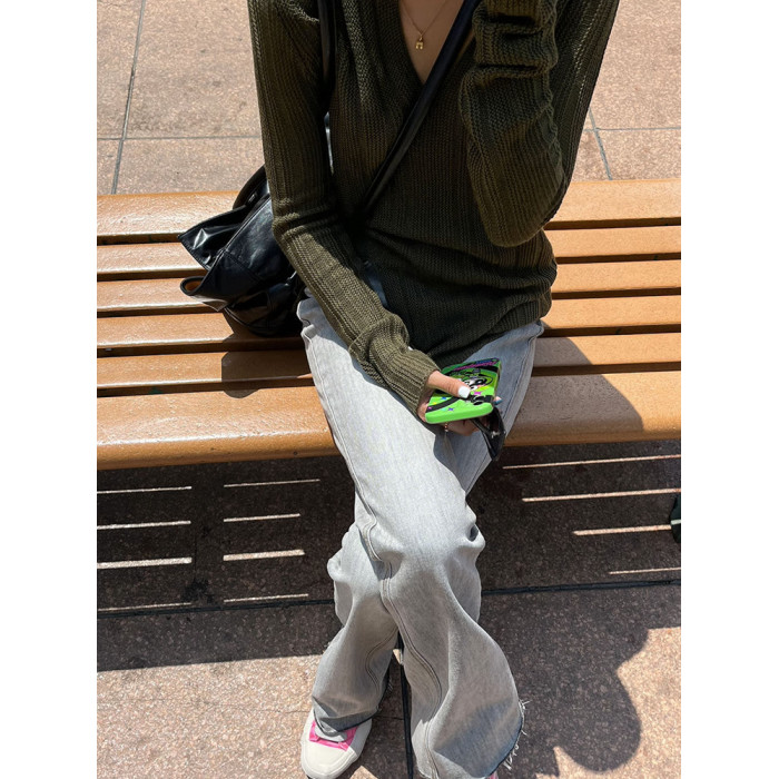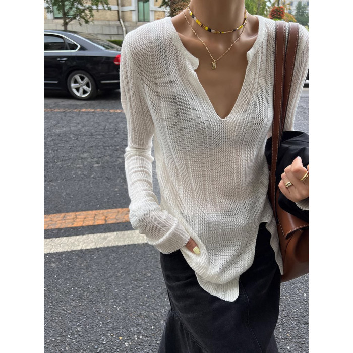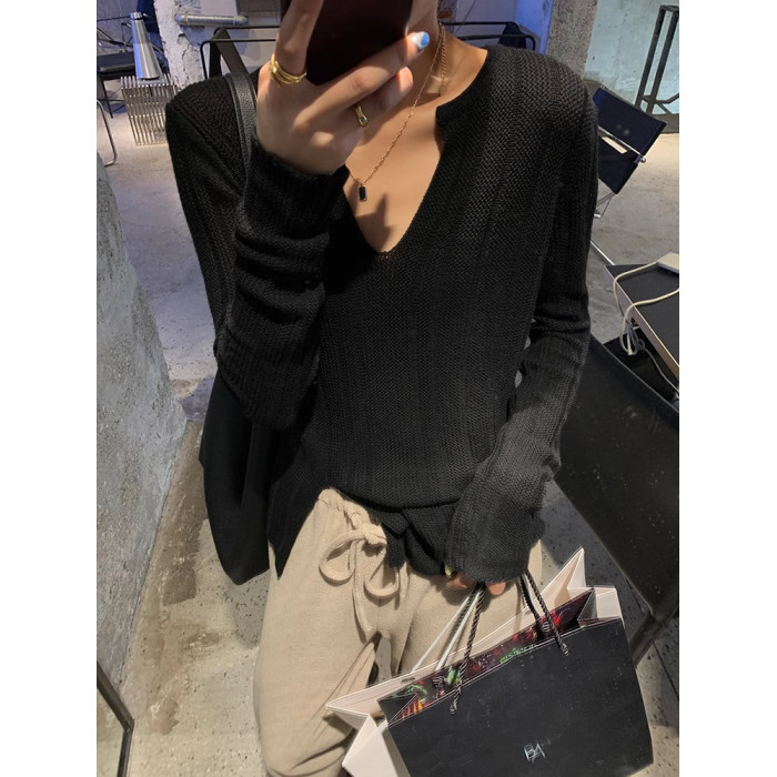 法式v領針織衫女開叉上衣2025新款氣質慵懶風修身內搭長袖打底衫