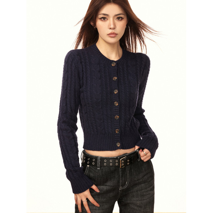 Aaisup美式慵懶風麻花開衫毛衣女春秋修身顯瘦內搭長袖針織打底衫
