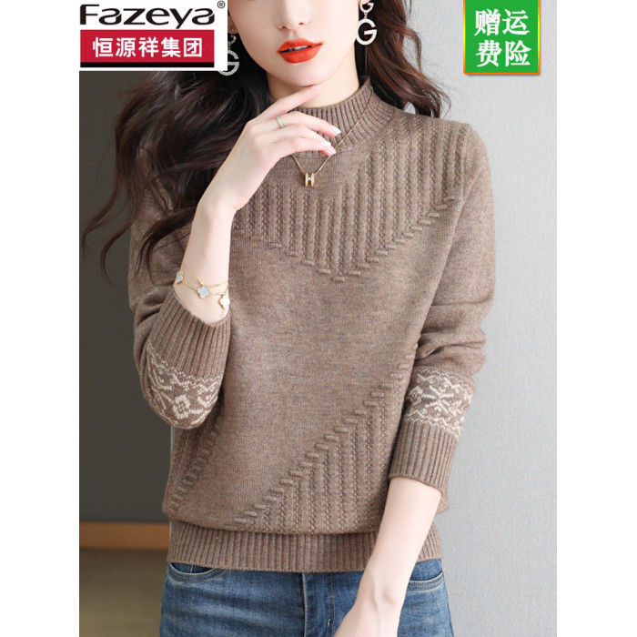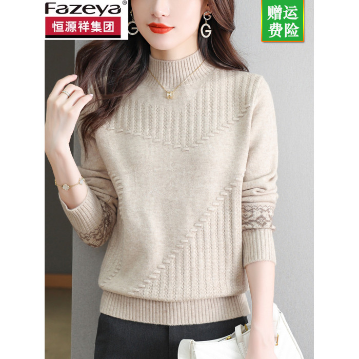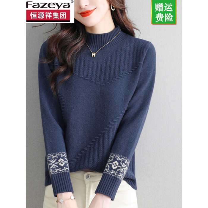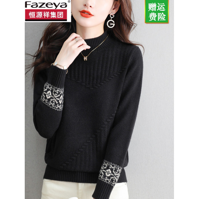 恒源祥彩羊毛衫女短款毛衣內搭保暖秋冬新款提花半高領打底衫加厚