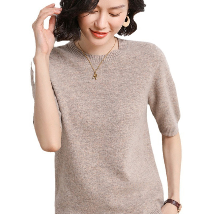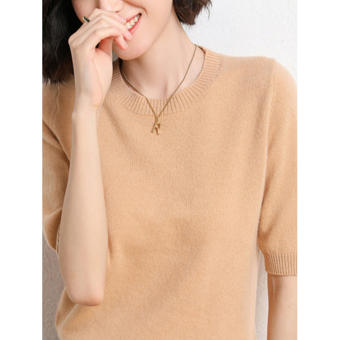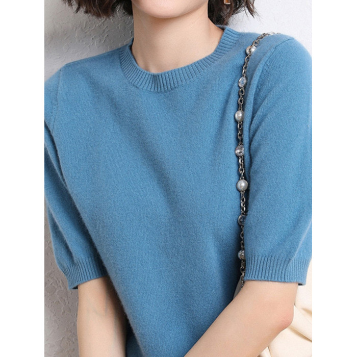 2025春秋新款氣質百搭短袖女五分袖圓領套頭薄針織打底衫半袖上衣