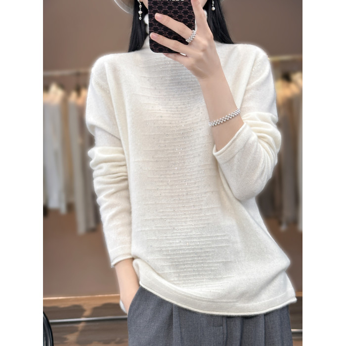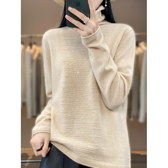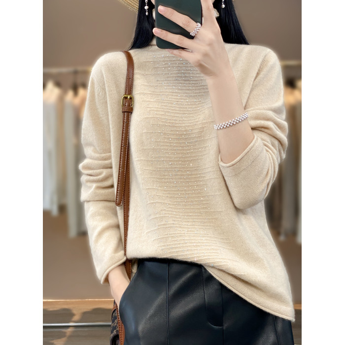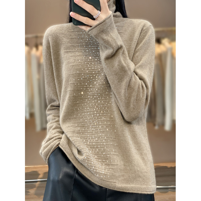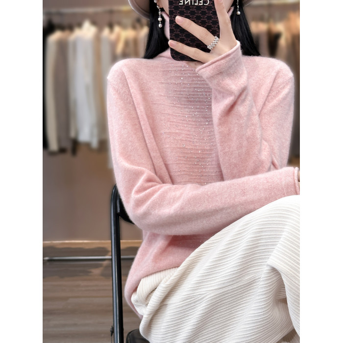 秋冬羊絨衫女堆堆裡領毛衣純色雙層立體帶鑽上衣羊毛針織打底衫
