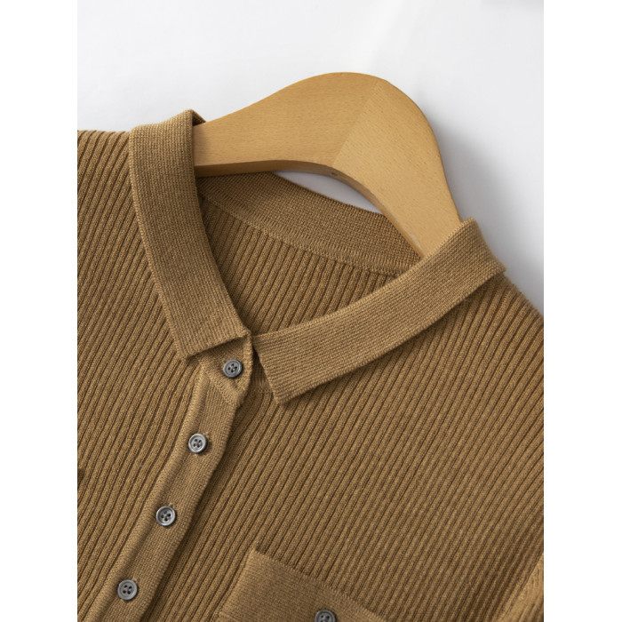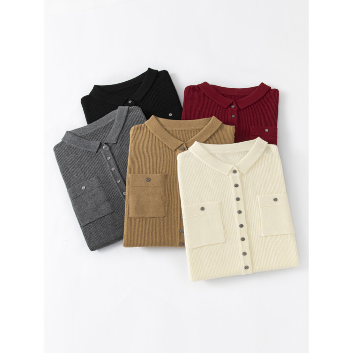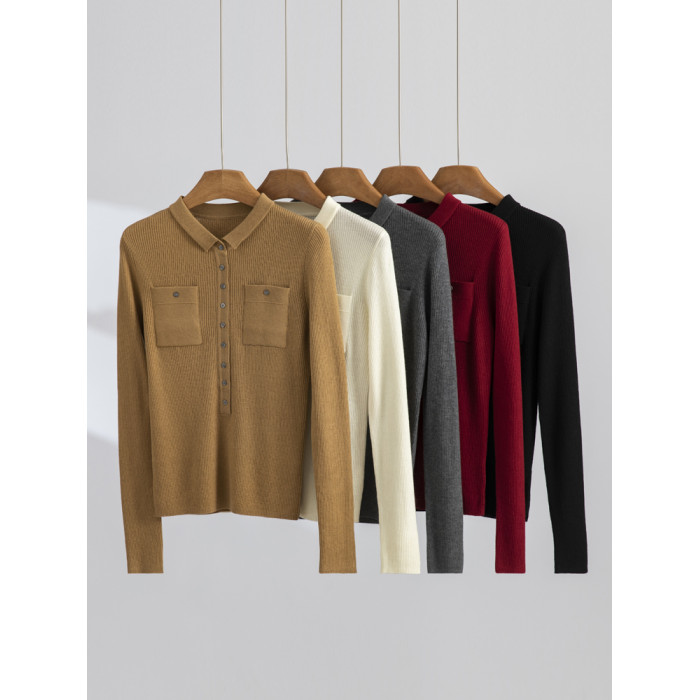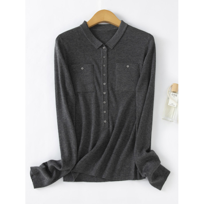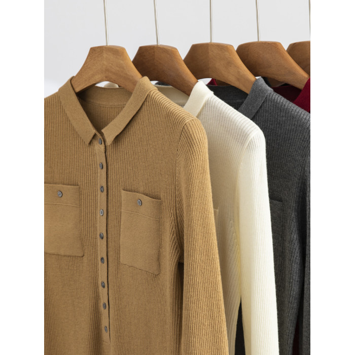 秋冬新款坑條帶兜翻領百搭羊絨毛衣開衫女長袖羊毛針織打底衫外穿
