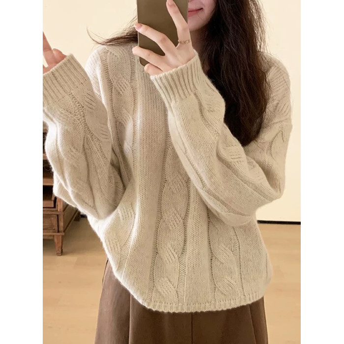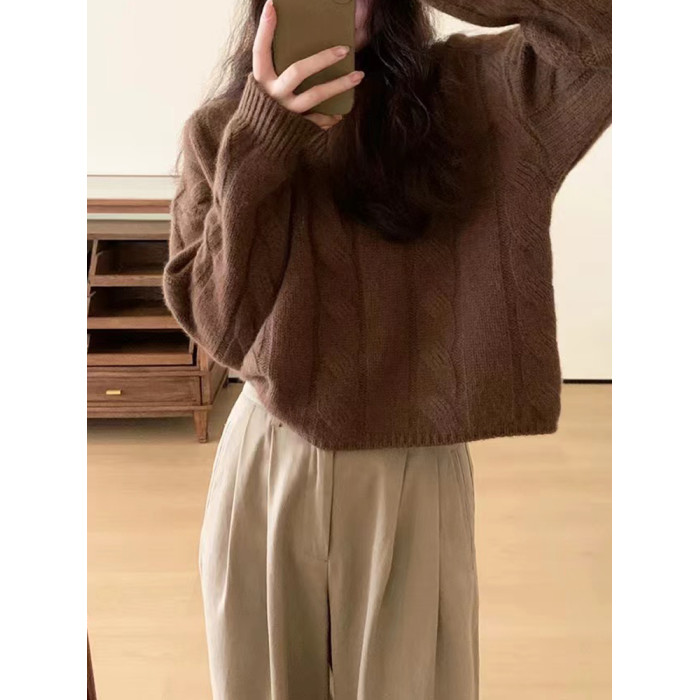 加厚保暖麻花套頭羊絨毛衣女秋冬新款V領慵懶寬松羊毛針織打底衫