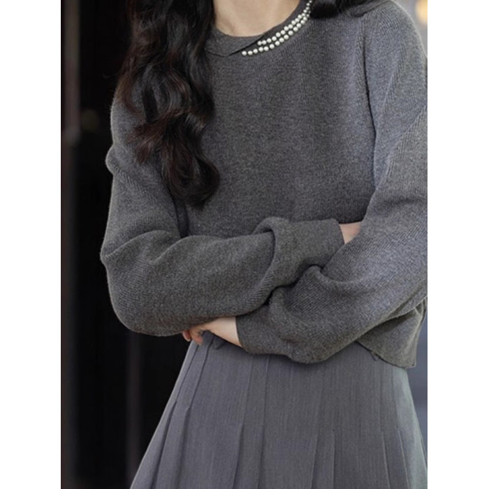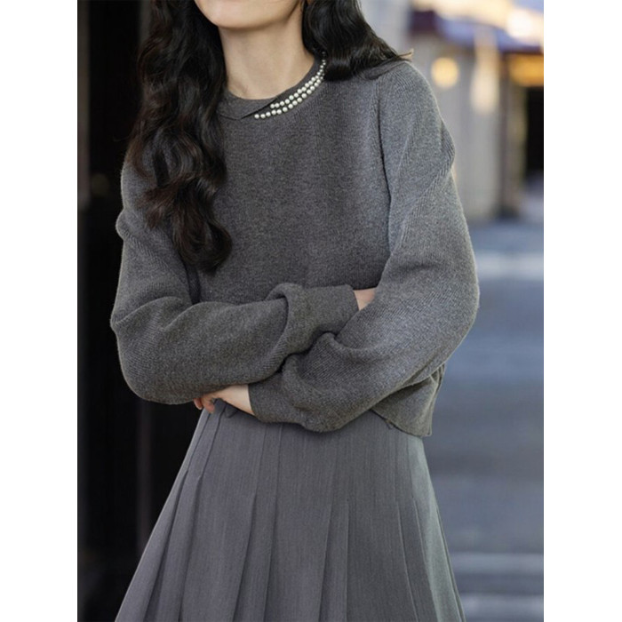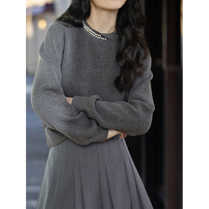 Basic House/百家好100%羊毛灰色圓領毛衣女秋季高級感內搭打底衫