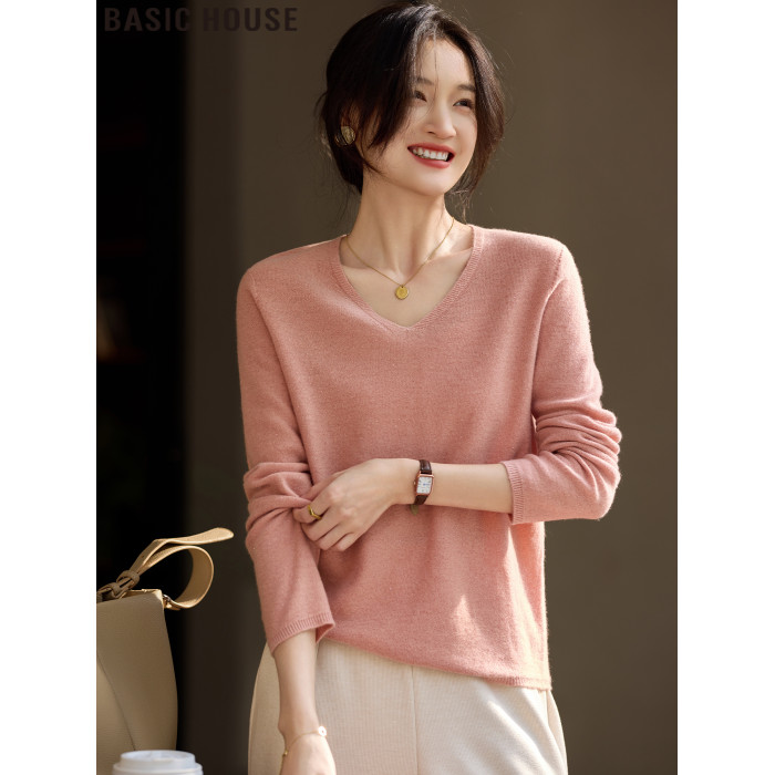 Basic House/百家好粉色雞心領時尚綿羊毛打底衫女士2025春季新款