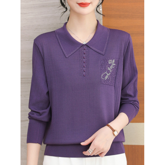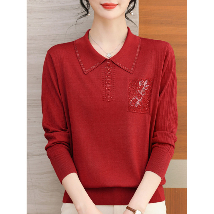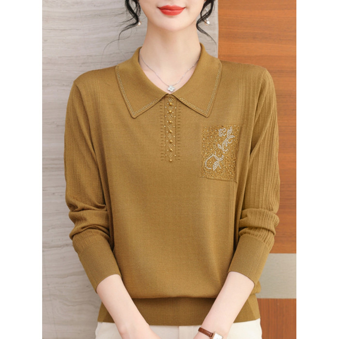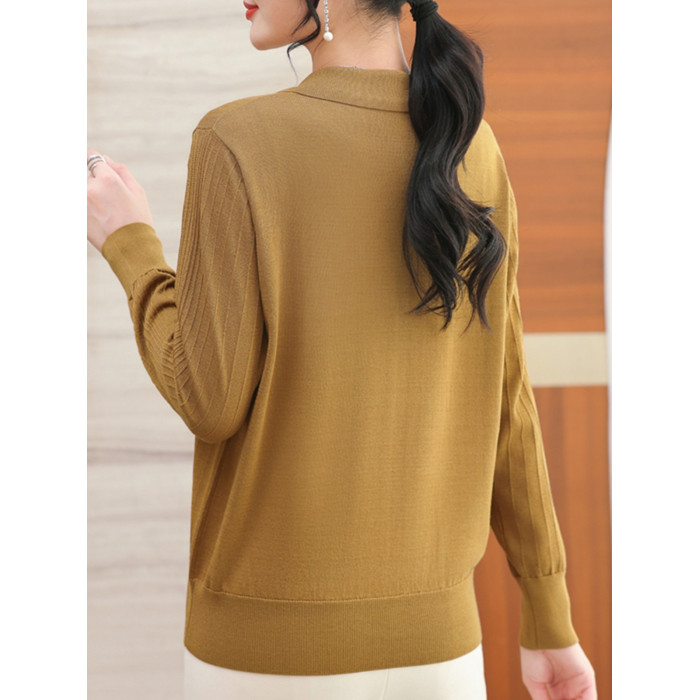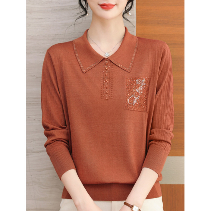 2024年新款翻領薄款針織衫女春裝中年媽媽毛衣洋氣時尚短款打底衫