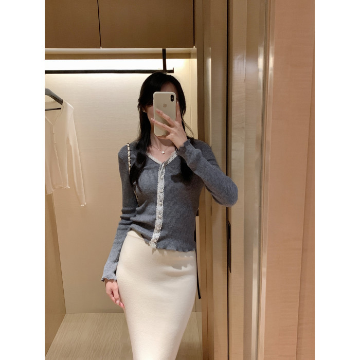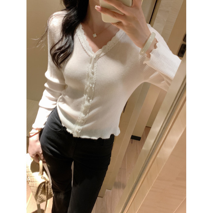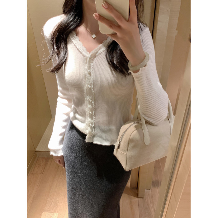 蕾絲花邊針織開衫女春秋季拼接v領打底衫上衣外搭薄款羊毛衫外套