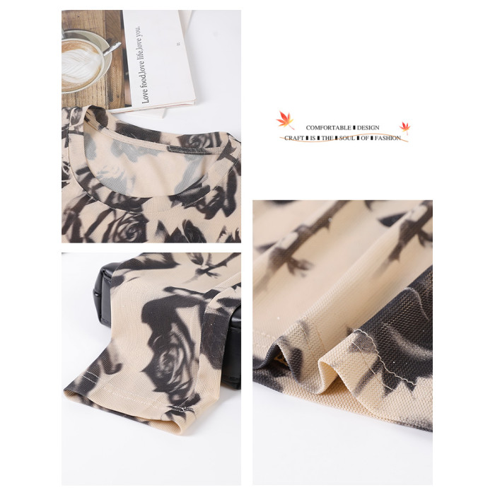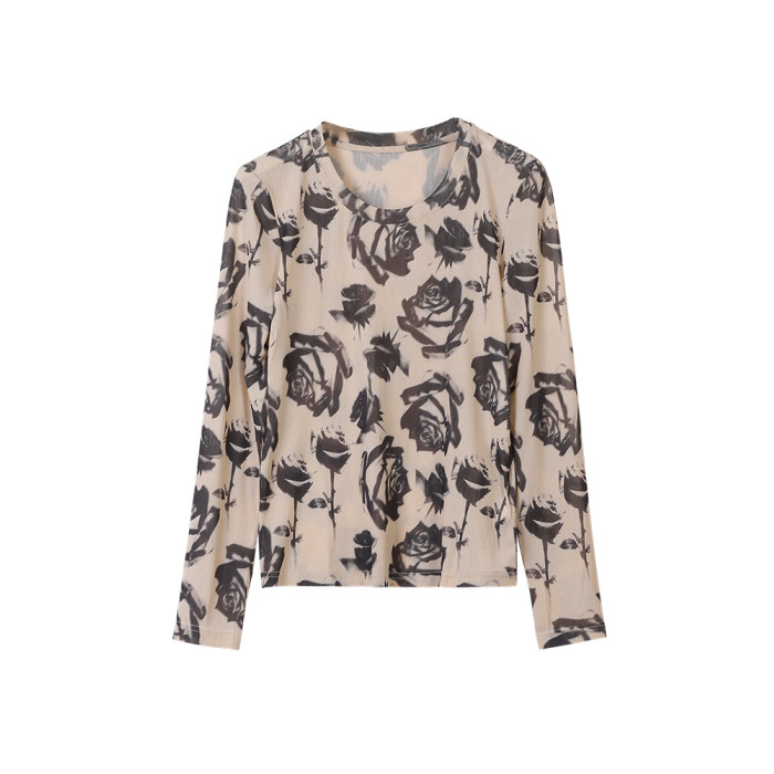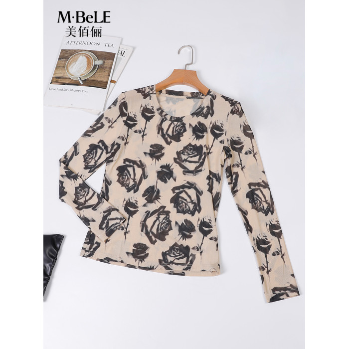 美佰儷2024秋冬新款玫瑰花印花圓領長袖恤女士修身顯瘦打底衫上衣