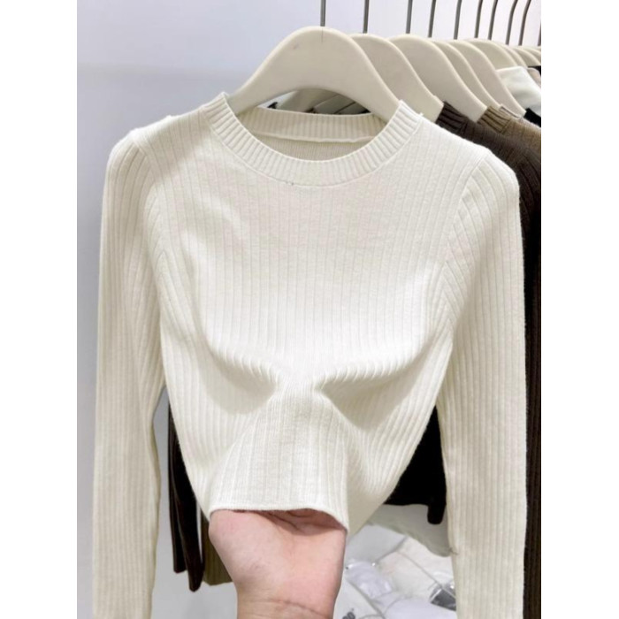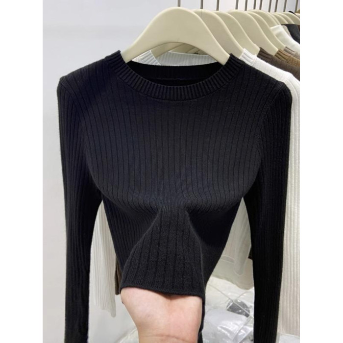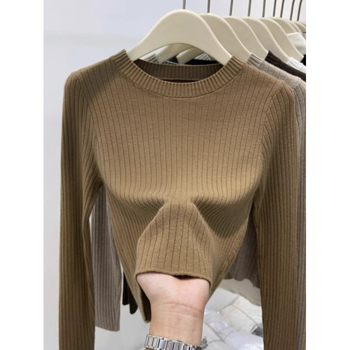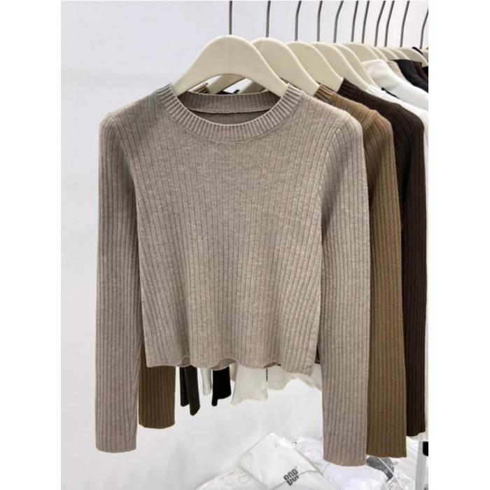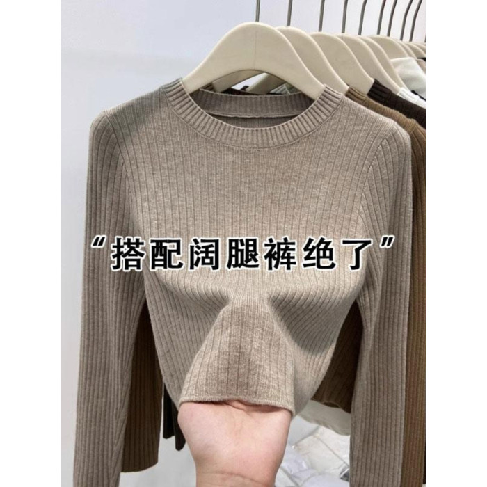 歐貨短款針織毛衣女2025秋裝小個子慵懶風軟糯坑條內搭打底衫上衣