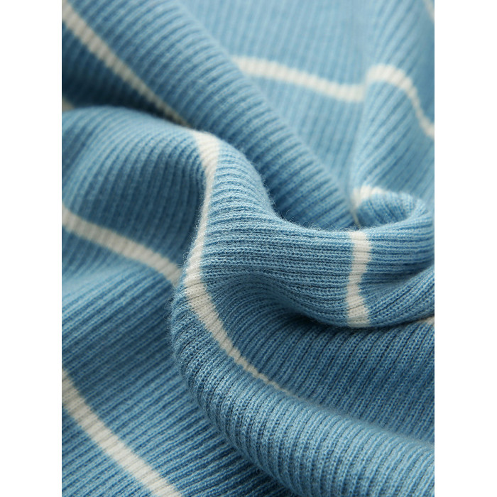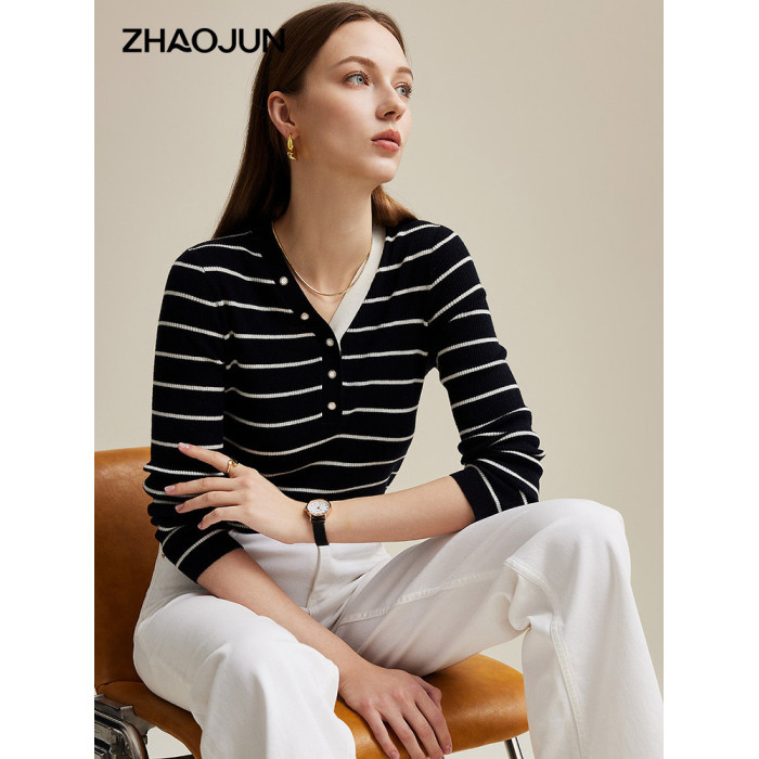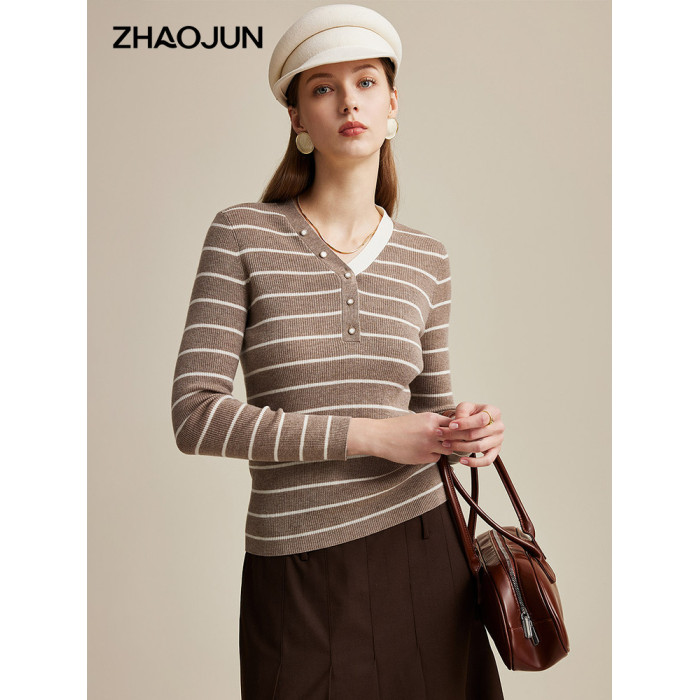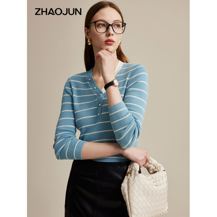 兆君2025春秋新款精紡條紋羊毛衫女v領長袖針織打底衫修身薄毛衣