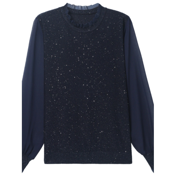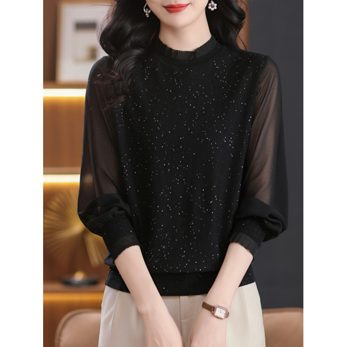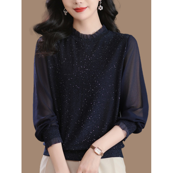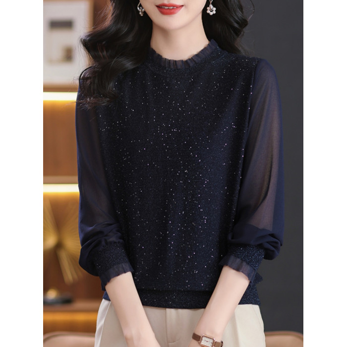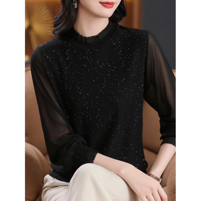 蕾絲花邊桑蠶絲紗袖針織衫女春秋裝薄款媽媽冰絲上衣遮肚子打底衫