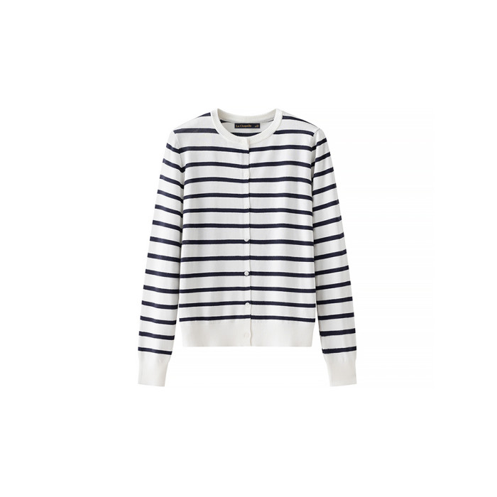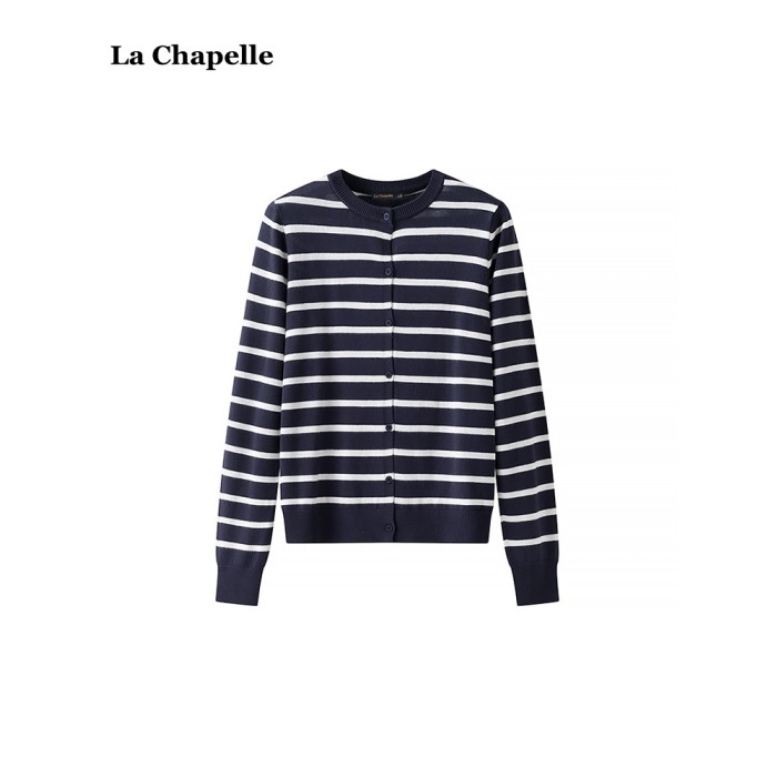 拉夏貝爾/La Chapelle圓領條紋針織開衫女春季新款長袖打底衫上衣