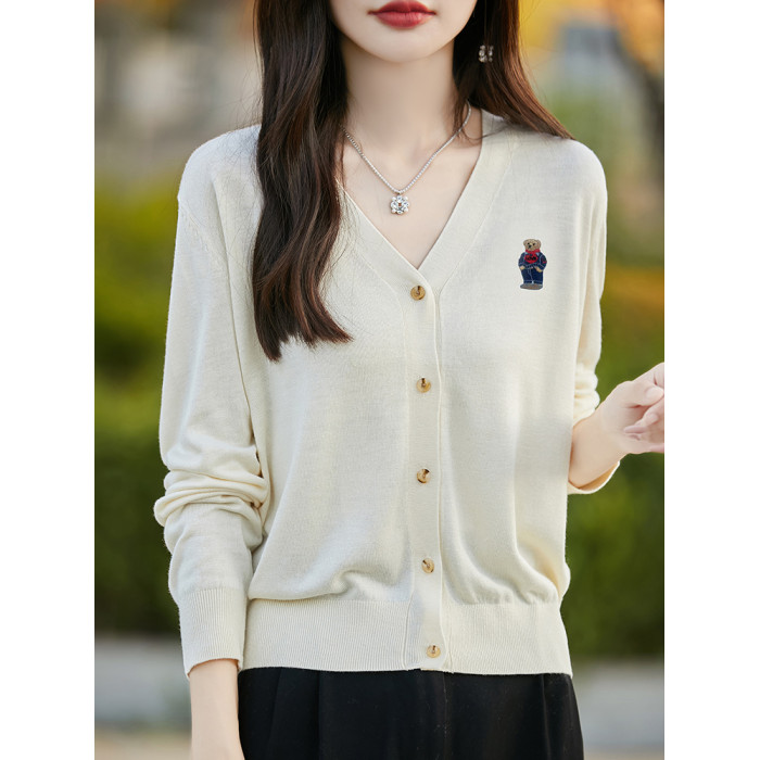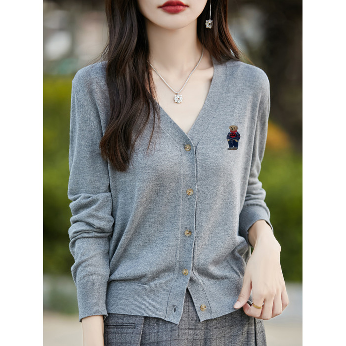 刺綉V領針織開衫女新款羊毛打底衫內搭薄款綠色毛衣外套短款上衣