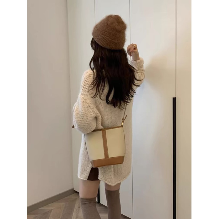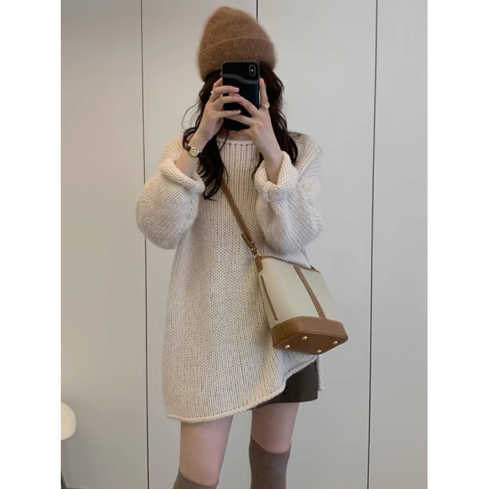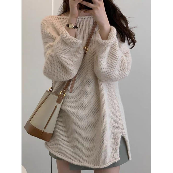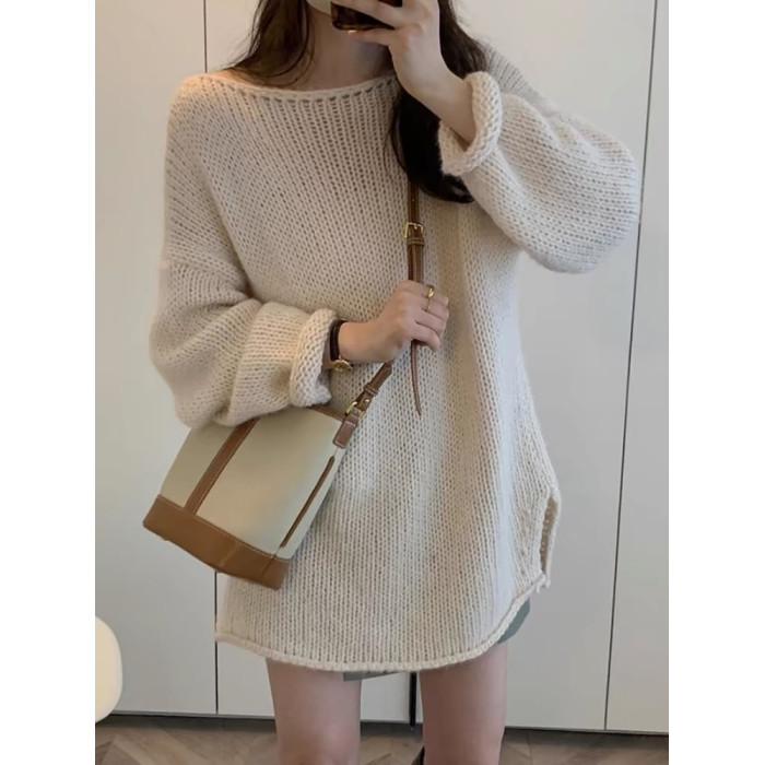 秋冬新品羊毛衫女寬松中長款落肩粗針白色毛衣一字領羊毛打底衫
