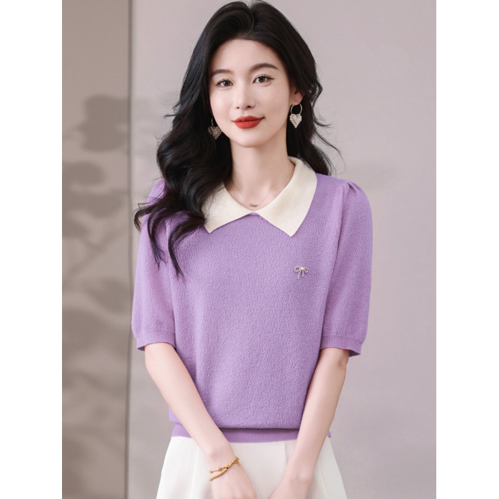 冰絲短袖針織衫女款2025新款娃娃領打底衫萊賽爾黃色天絲t恤上衣