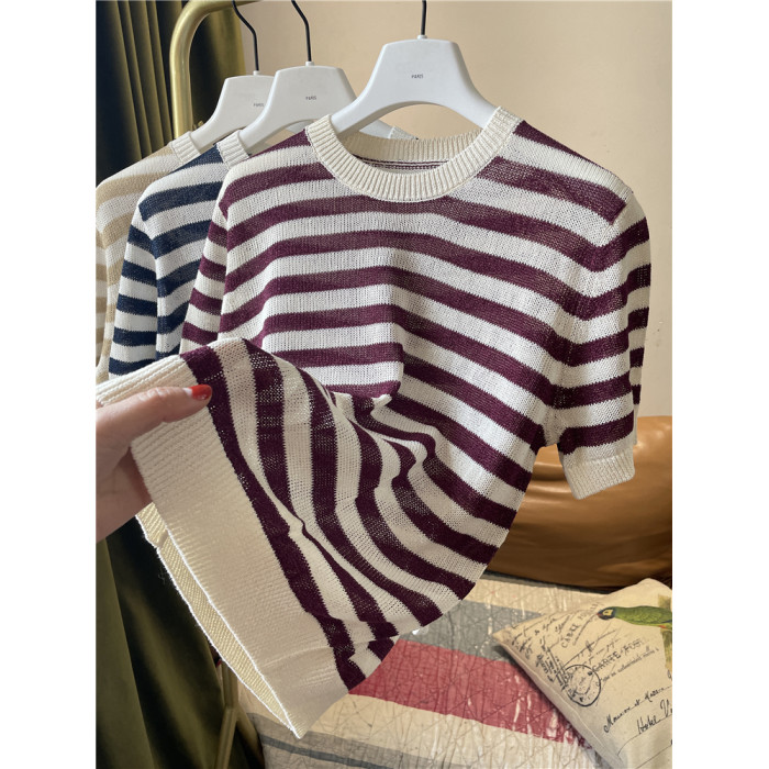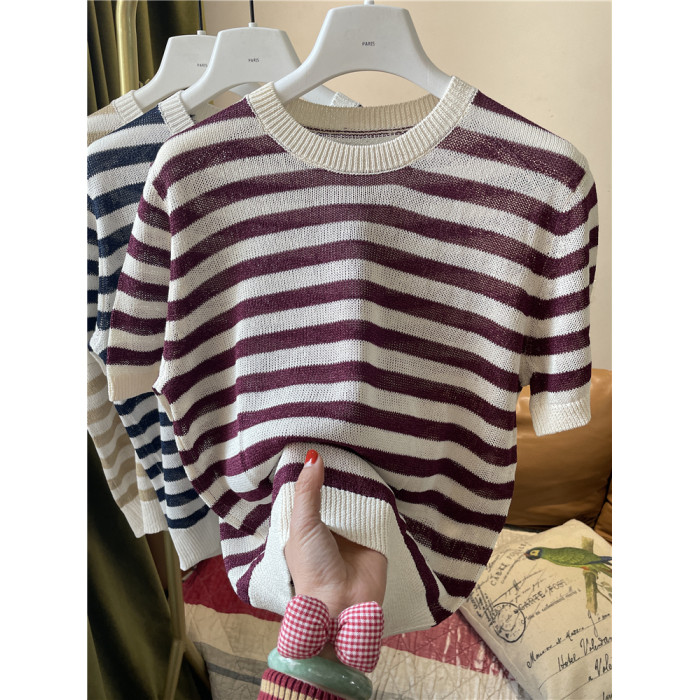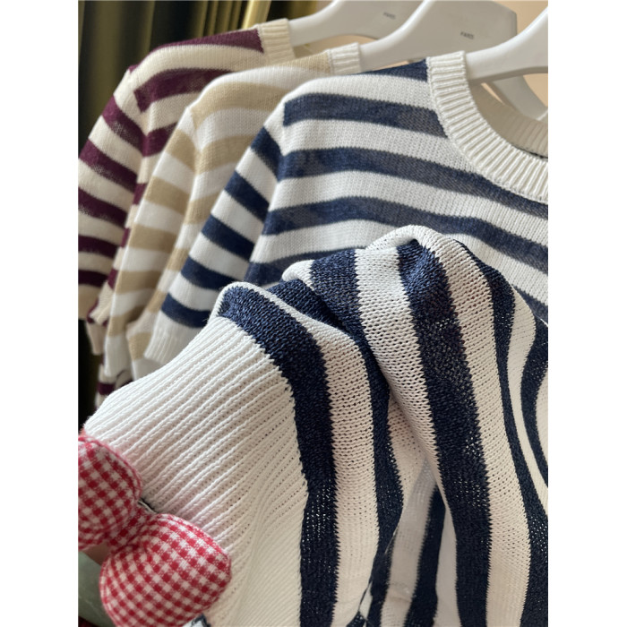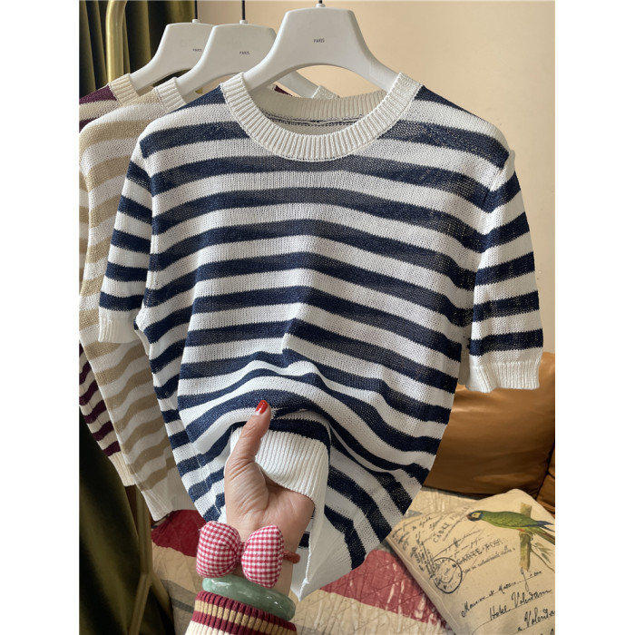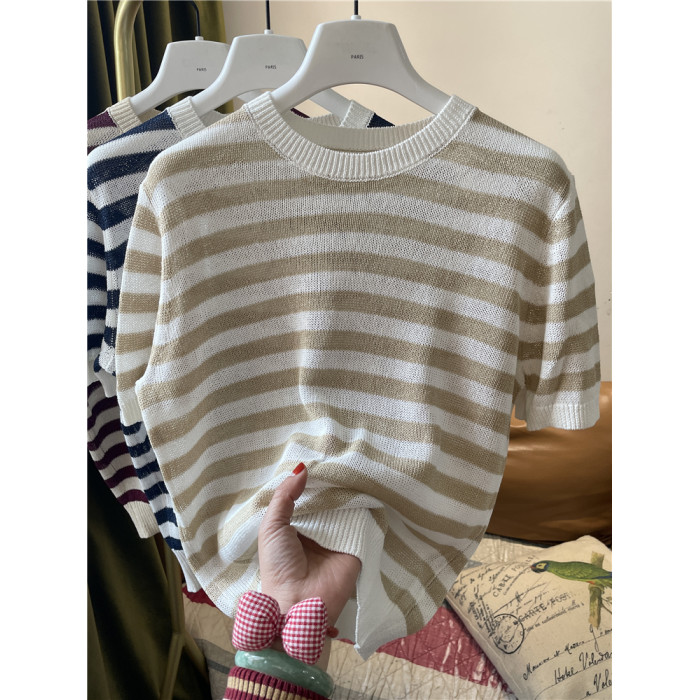 天絲亞麻撞色條紋針織衫女圓領套頭短袖上衣內搭外穿百搭打底衫