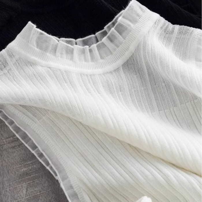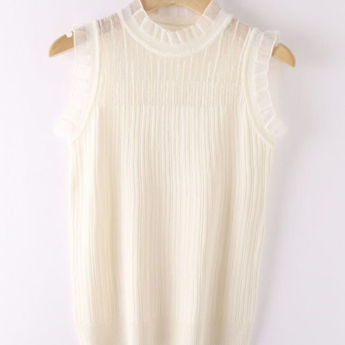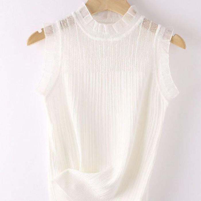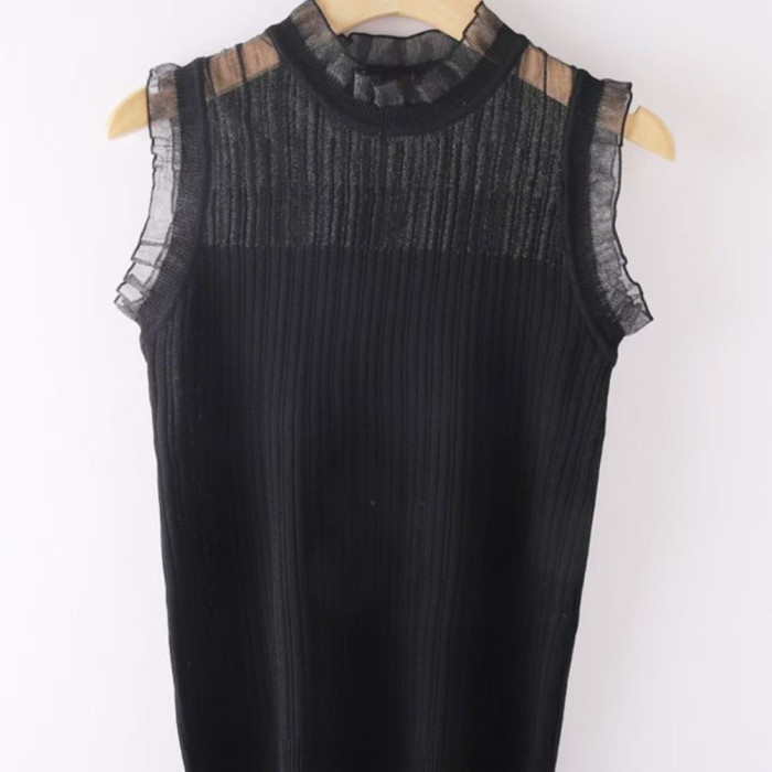 夏季新款網紗半高領針織小吊帶背心女打底衫無袖短款上衣外穿蕾絲