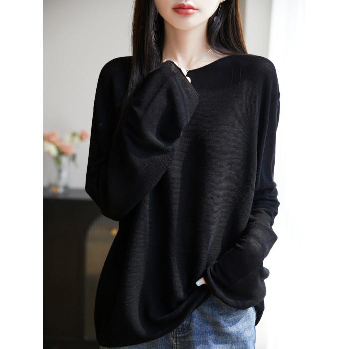 春夏一字領天絲針織打底衫女寬松外穿慵懶風長袖上衣亞麻防曬罩衫