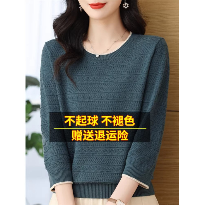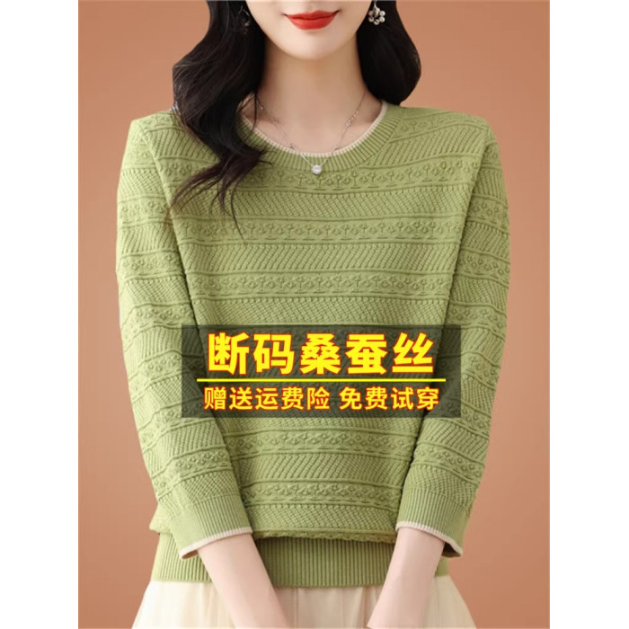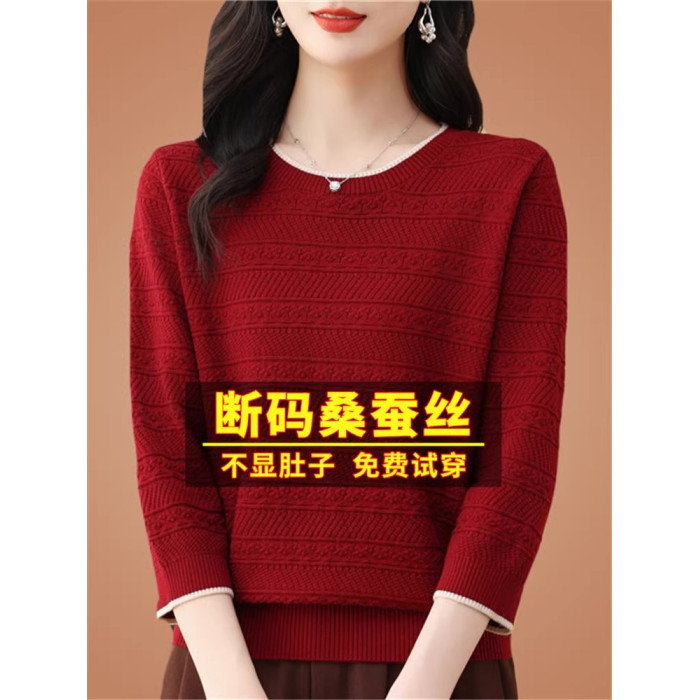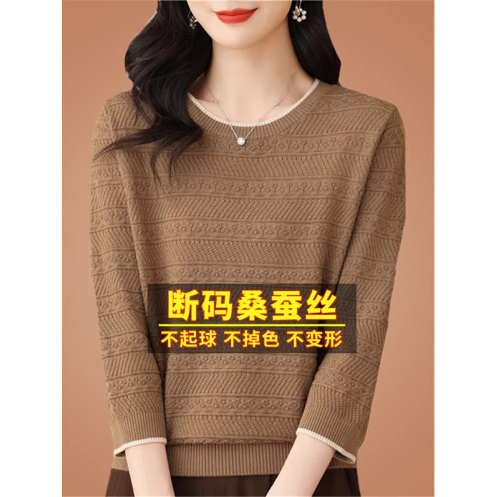 桑蠶絲七分袖針織小衫女寬松上衣中年媽媽裝薄款春秋夏中袖打底衫
