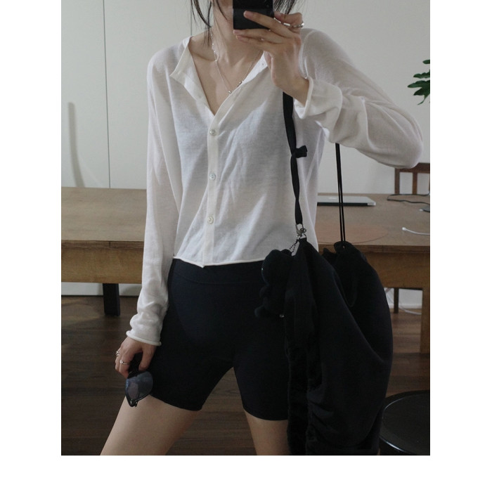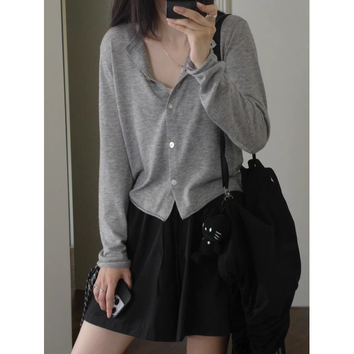 灰色天絲羊毛開衫女圓領長袖上衣薄款針織衫外套百搭短款打底衫