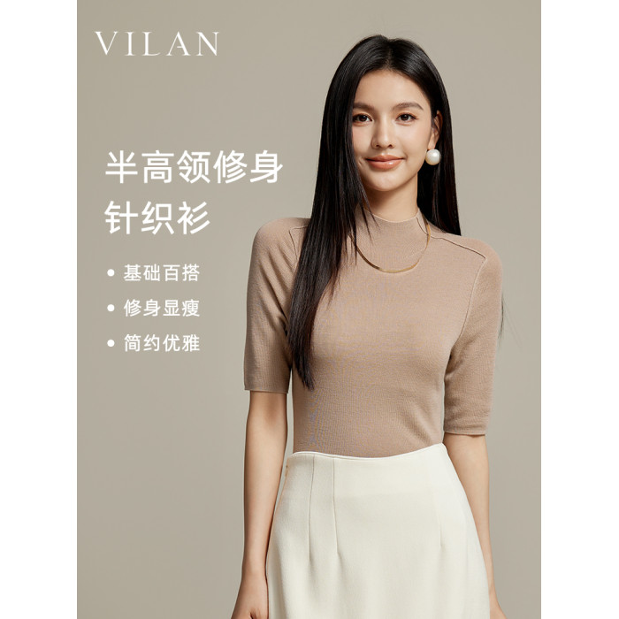 vilan/慧蘭100%綿羊毛短袖針織衫女薄款純色簡約套頭半高領打底衫