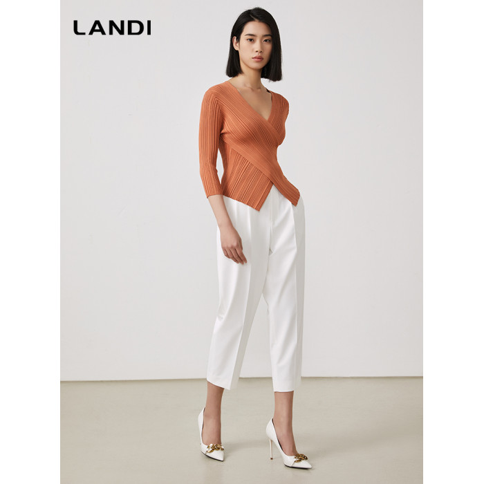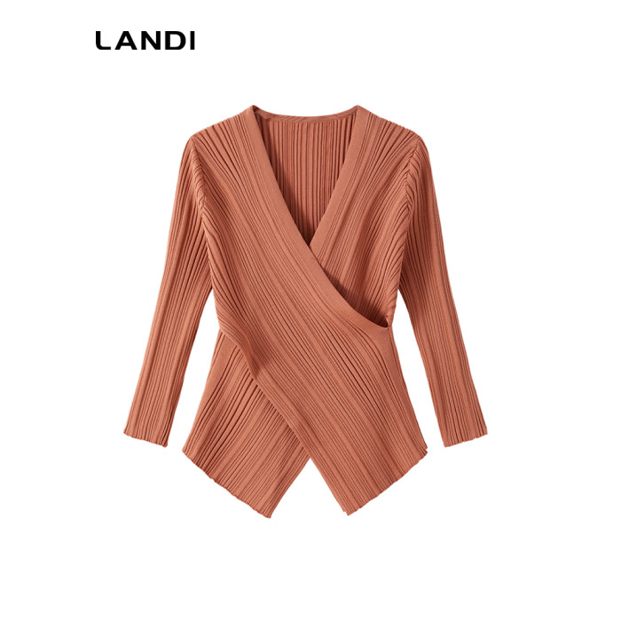 LANDI交叉V領設計感修身顯瘦針織衫女春新品肌理感打底衫上衣