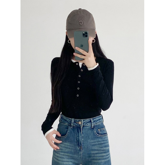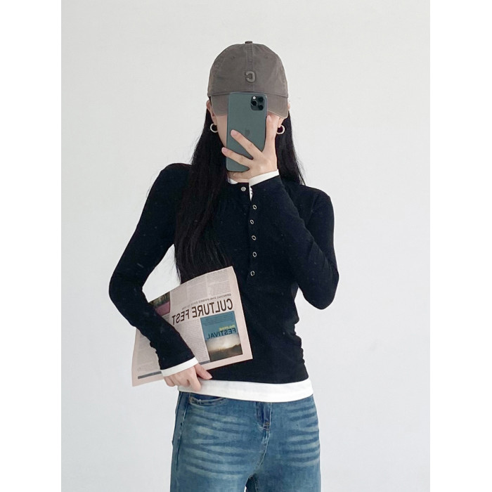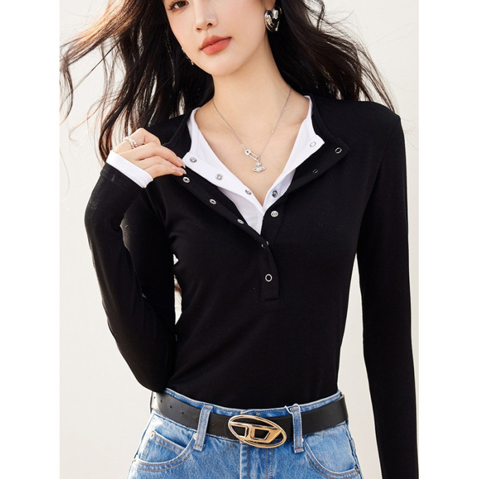 美式領修身毛針織衫女假兩件長袖內搭上衣打底衫2025秋季黑色